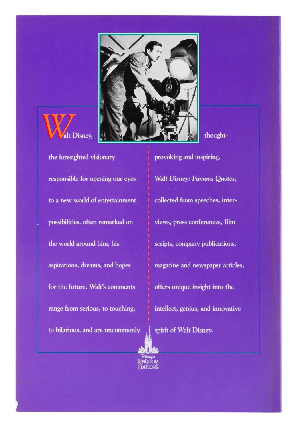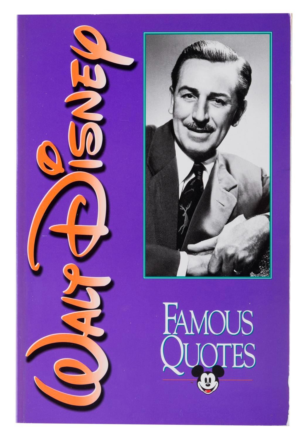 (Disney, 1994) A Walt Disney Famous Quotes book, created exclusively for the Disney Parks and compiled by Dave Smith from the Disney Archives. Included inside is a torn-out page from a different book, featuring a photo of Walt Disney and Dolores Del Rio. Measuring 6.25” x 9.25”, the book is in very good condition with light scratches and wear on the cover.