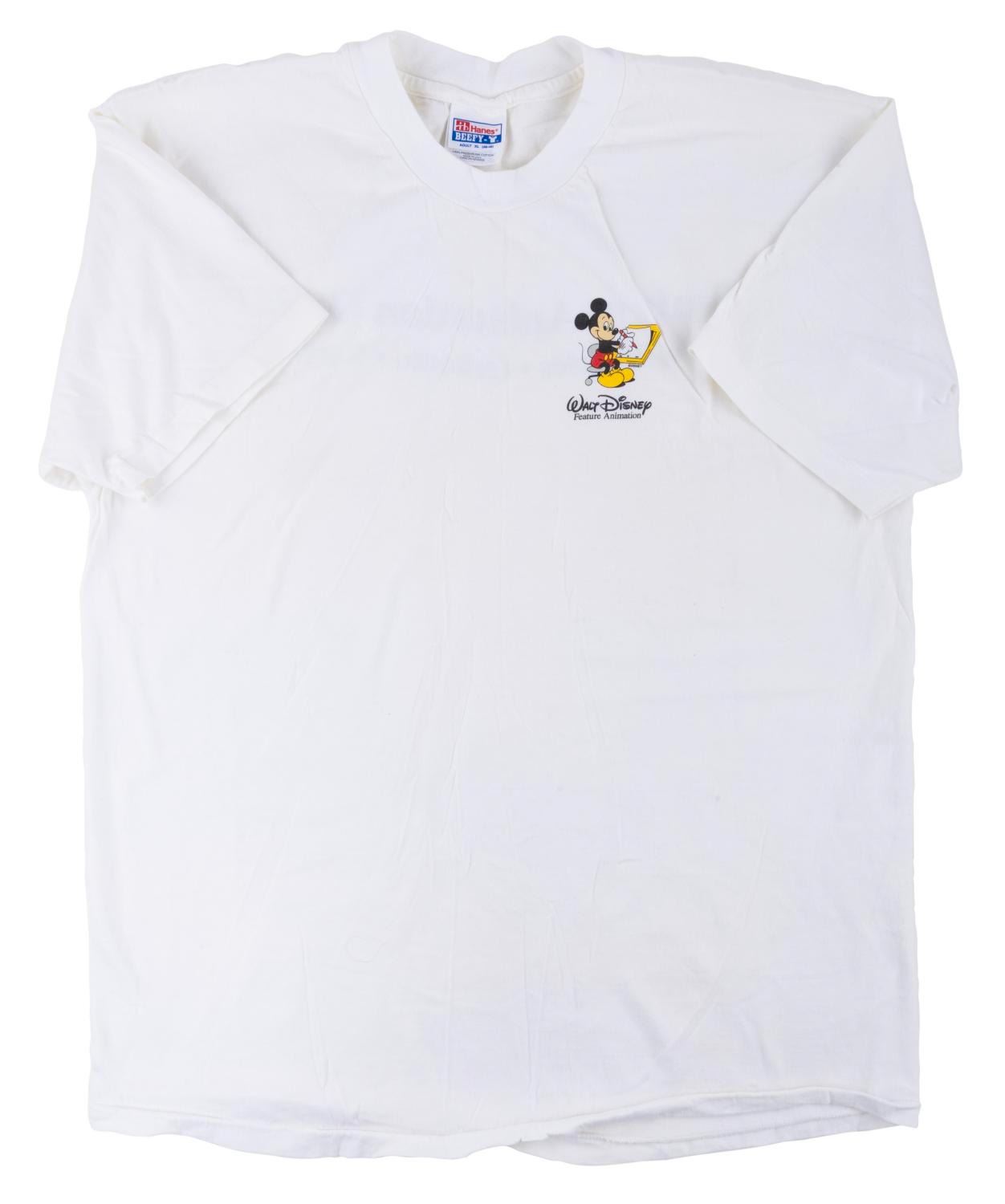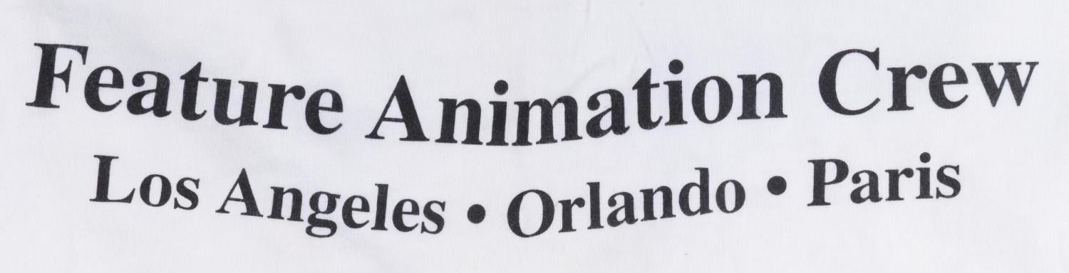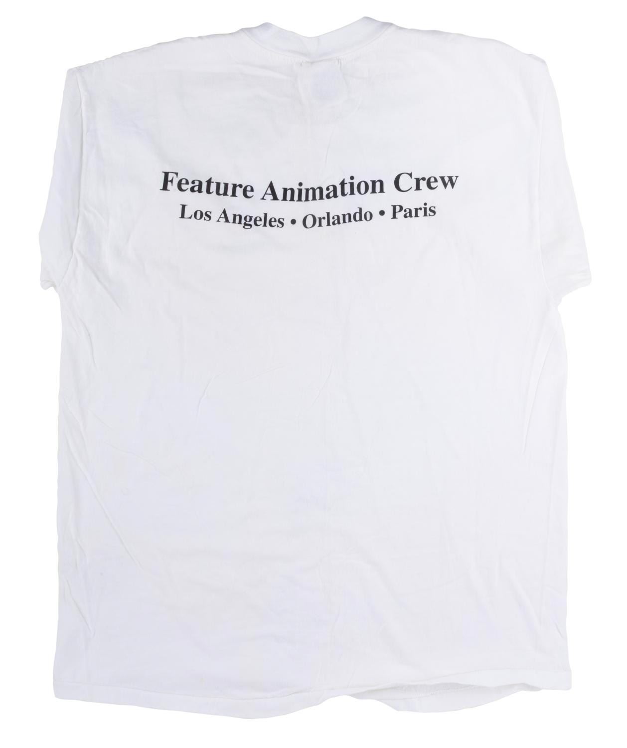 (Disney, 1990s) A Walt Disney Feature Animation crew T-shirt with the Studio's Los Angeles, Orlando, and Paris locations listed on the back. Labeled a size XL, the shirt displays in very good condition with a small stain on the right sleeve.