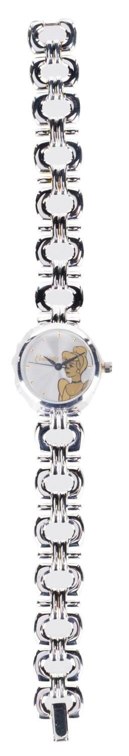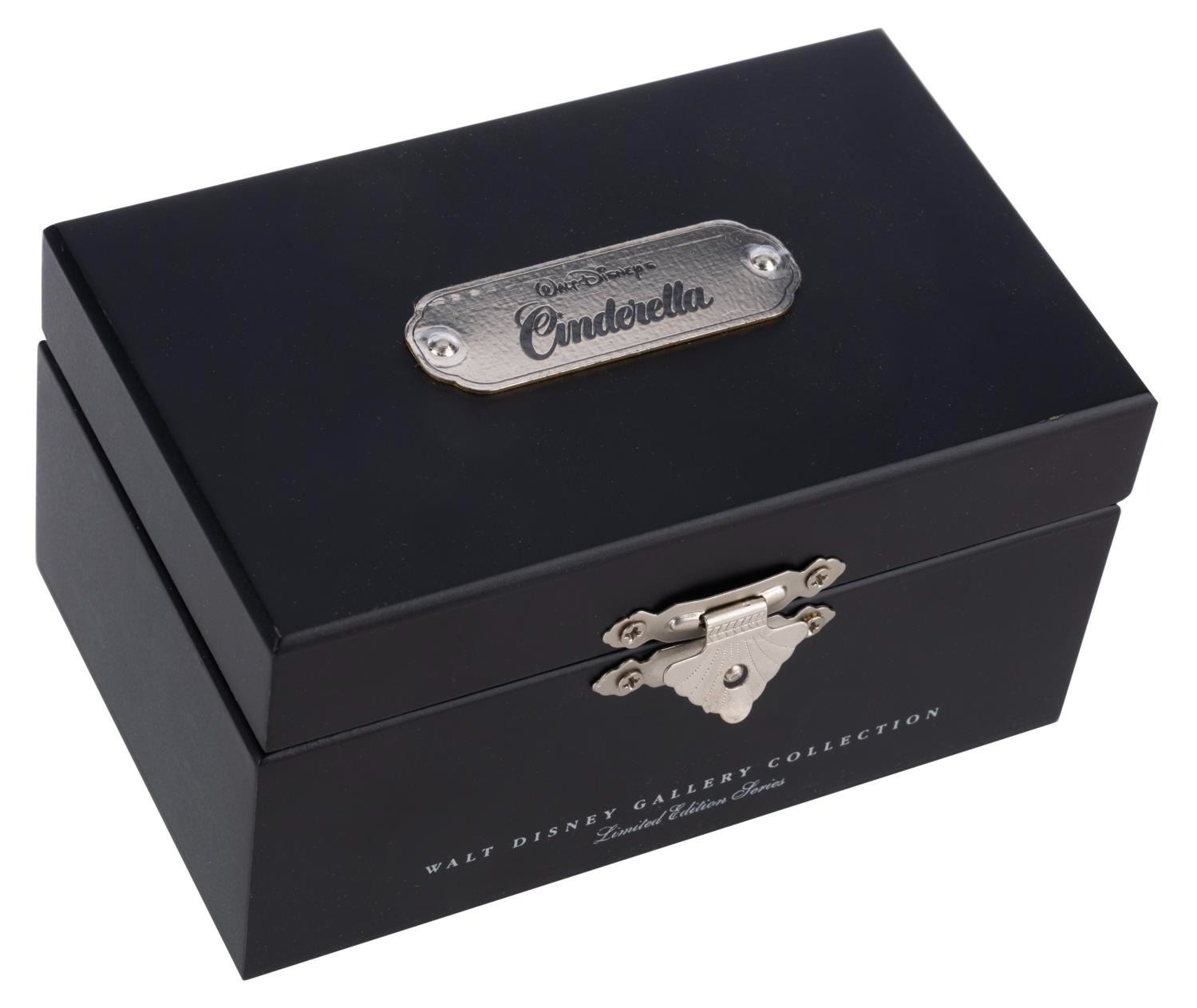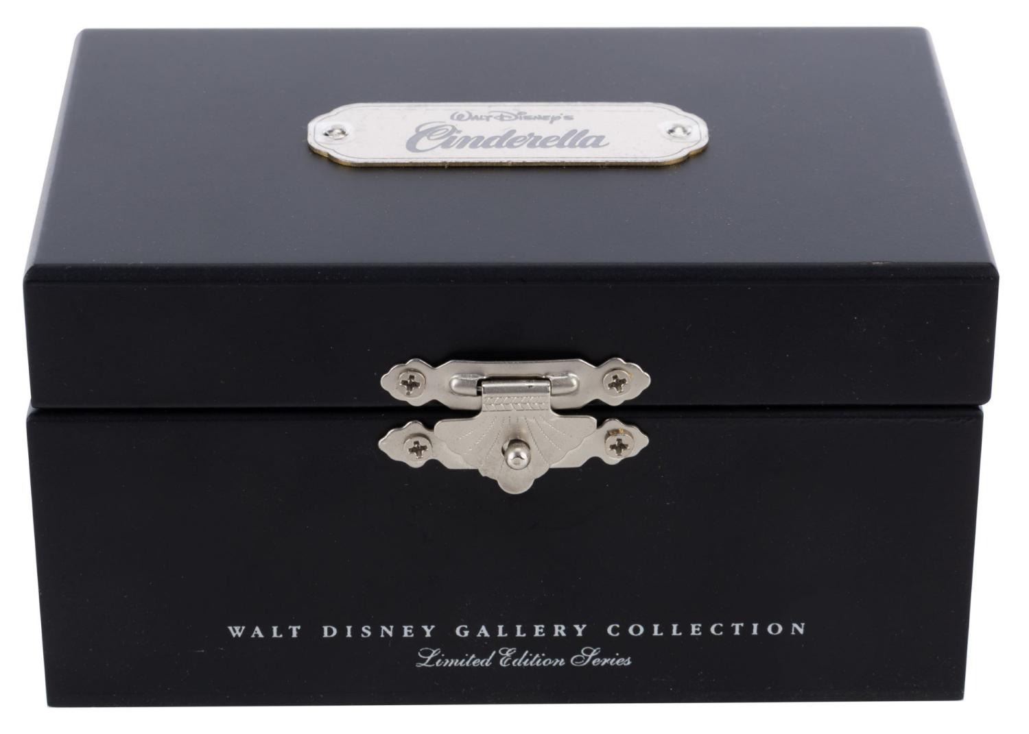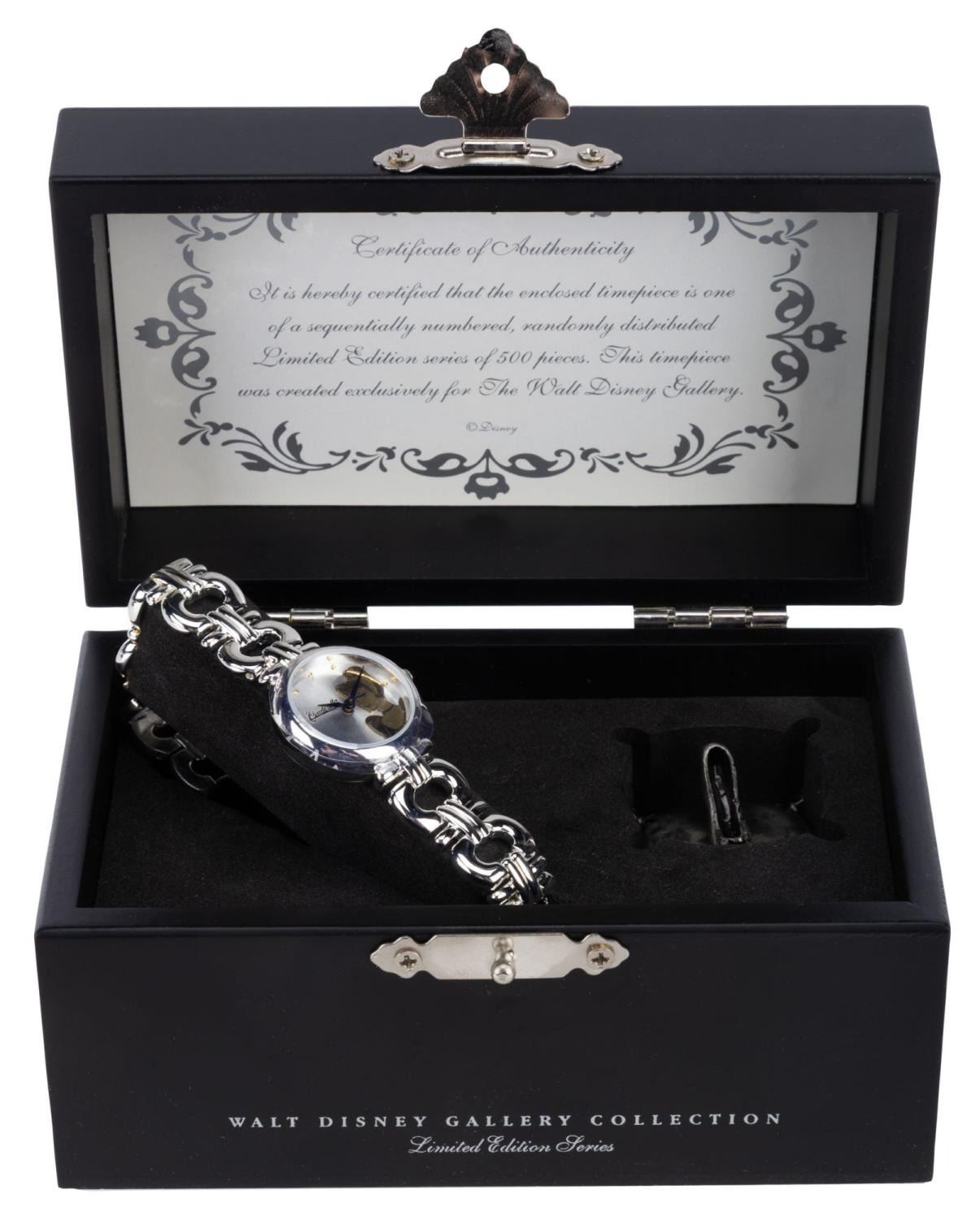(Disney, 1990s) A "Cinderella" watch with a pewter slipper on a pillow, released in a limited edition of only 500 by The Walt Disney Gallery. In the box measuring 2.75" x 3.25" x 5.25", the ladies watch numbered 10/500 and the pewter piece are in fine condition. The watch likely requires a battery and possibly service to function.