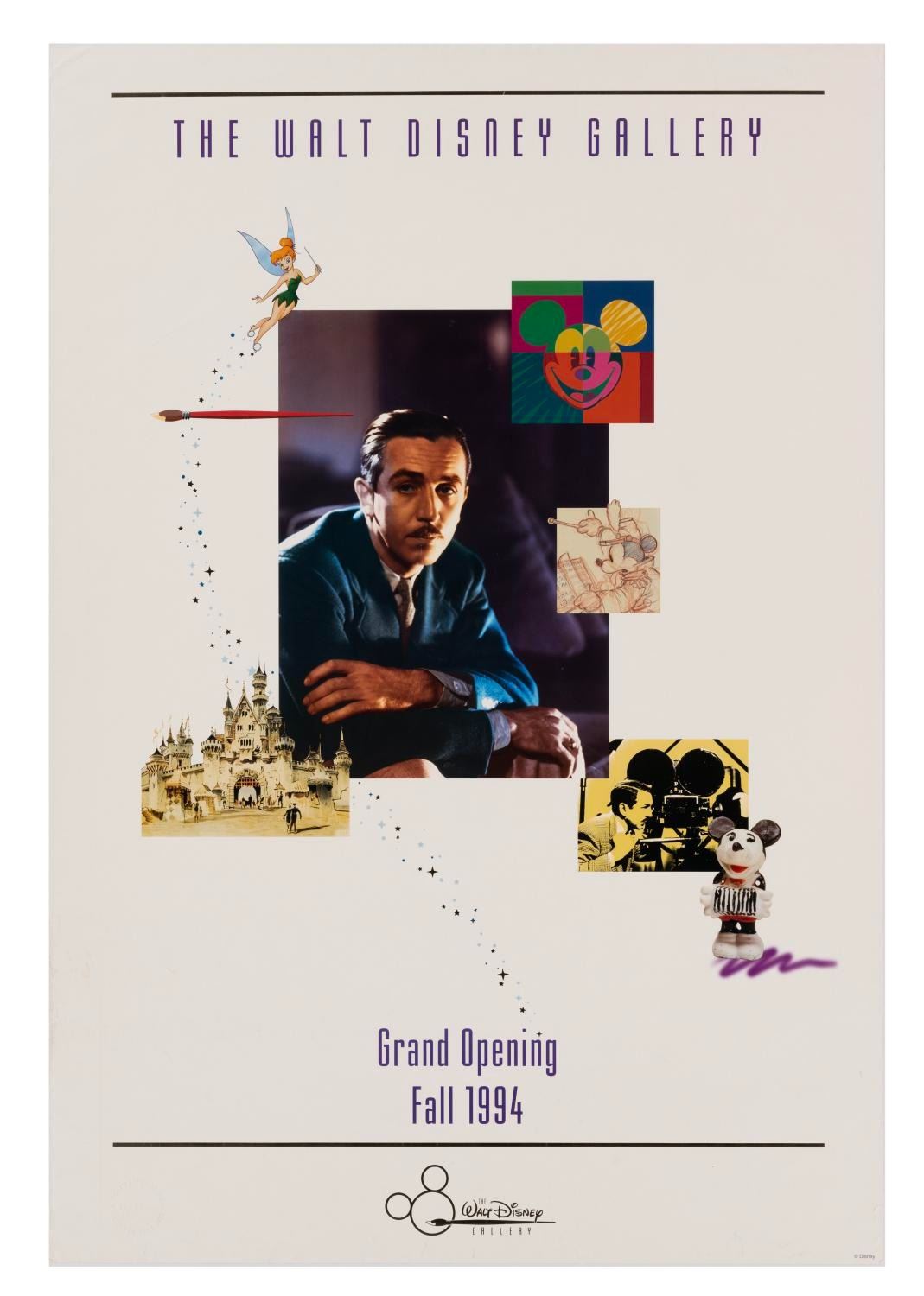 (Disneyland, 1994) A poster for the grand opening of the Walt Disney Gallery located above Pirates of the Caribbean, featuring "1994 Exclusive Commemorative Issue" embossed on the bottom left corner. Measuring 27" x 40", the poster displays in good condition with minor scuffing throughout and small pink markings on the left side.