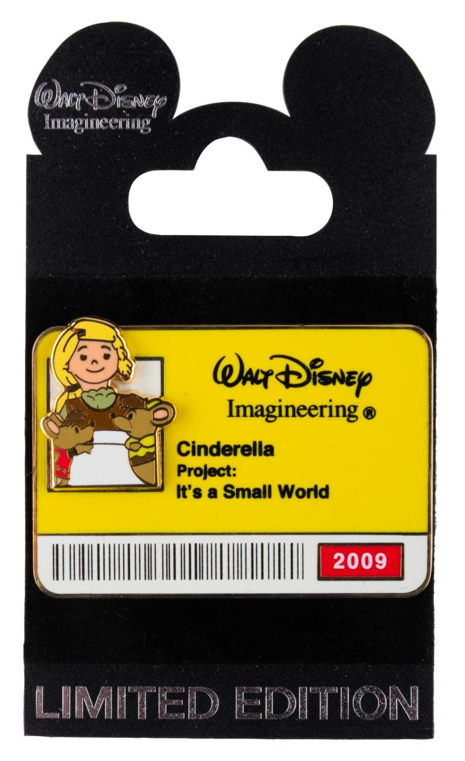 (WDI, 2009) A limited edition 300 pin exclusive to Walt Disney Imagineering in Glendale of the Cinderella doll from It's a Small World’s imaginary employee badge. Measuring 1.25" x 2", the pin is in fine condition on the original card.