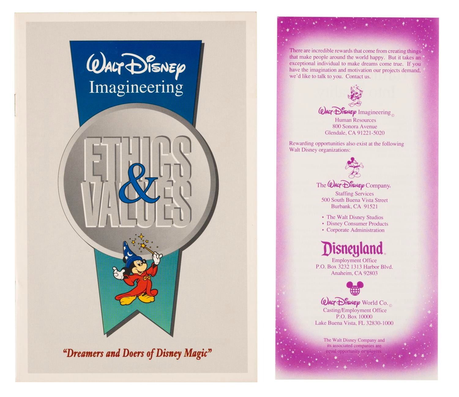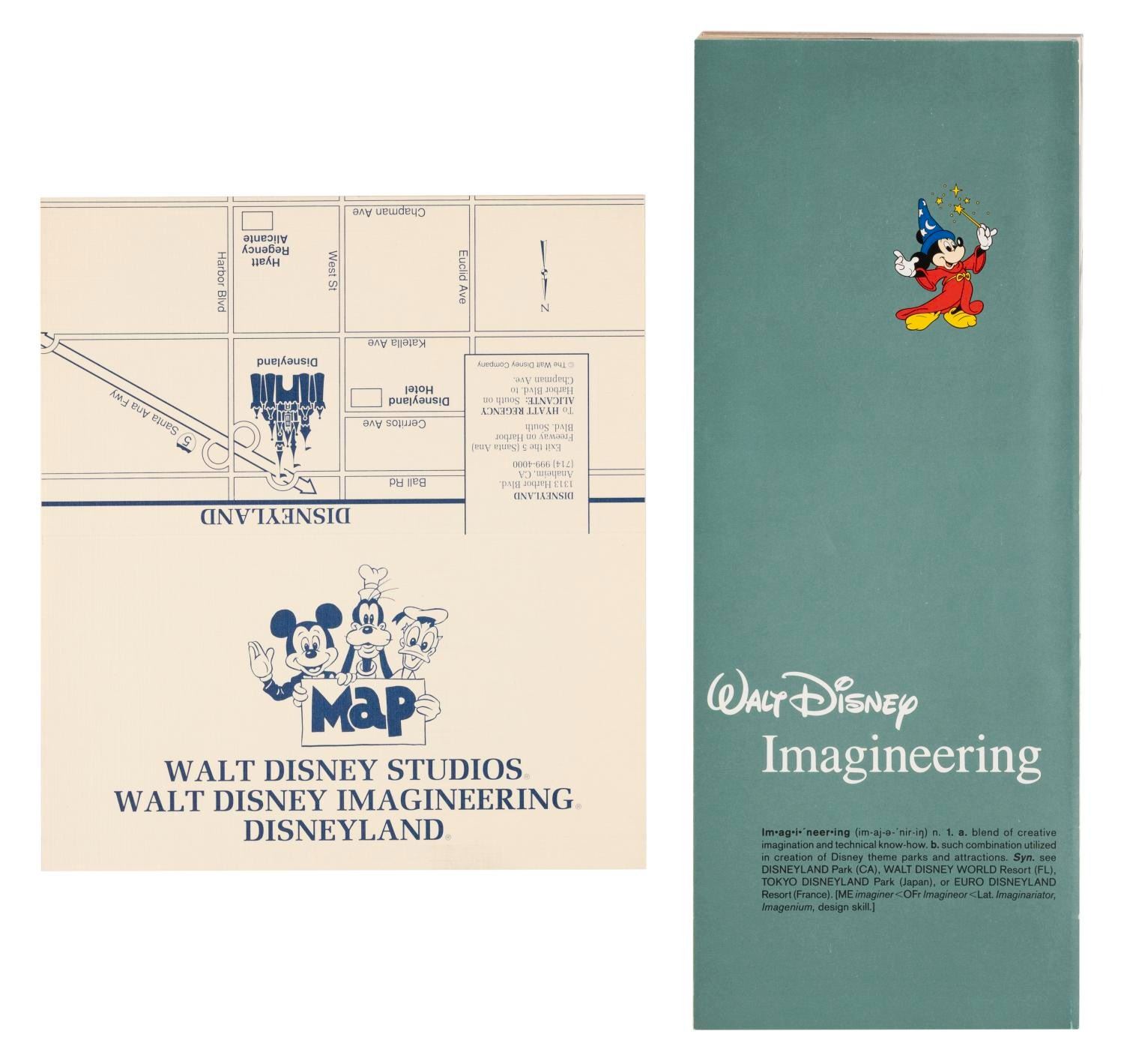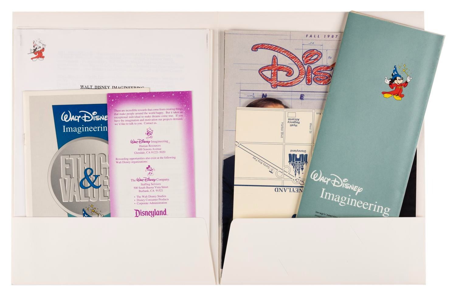 (Walt Disney Imagineering, 1980s) A Walt Disney Imagineering employment package including an article on Imagineering facts, a 1987 Disney News magazine, a Blaine Gibson "Partners" statue concept art print, a history of Imagineering pamphlet, a career opportunities flyer, a map card with directions to Disneyland, the Walt Disney Studios, and Walt Disney Imagineering, and an Imagineering Ethics & Values booklet. The folder measures 9" x 12", and it and the contents are in very good condition with light wear from use.