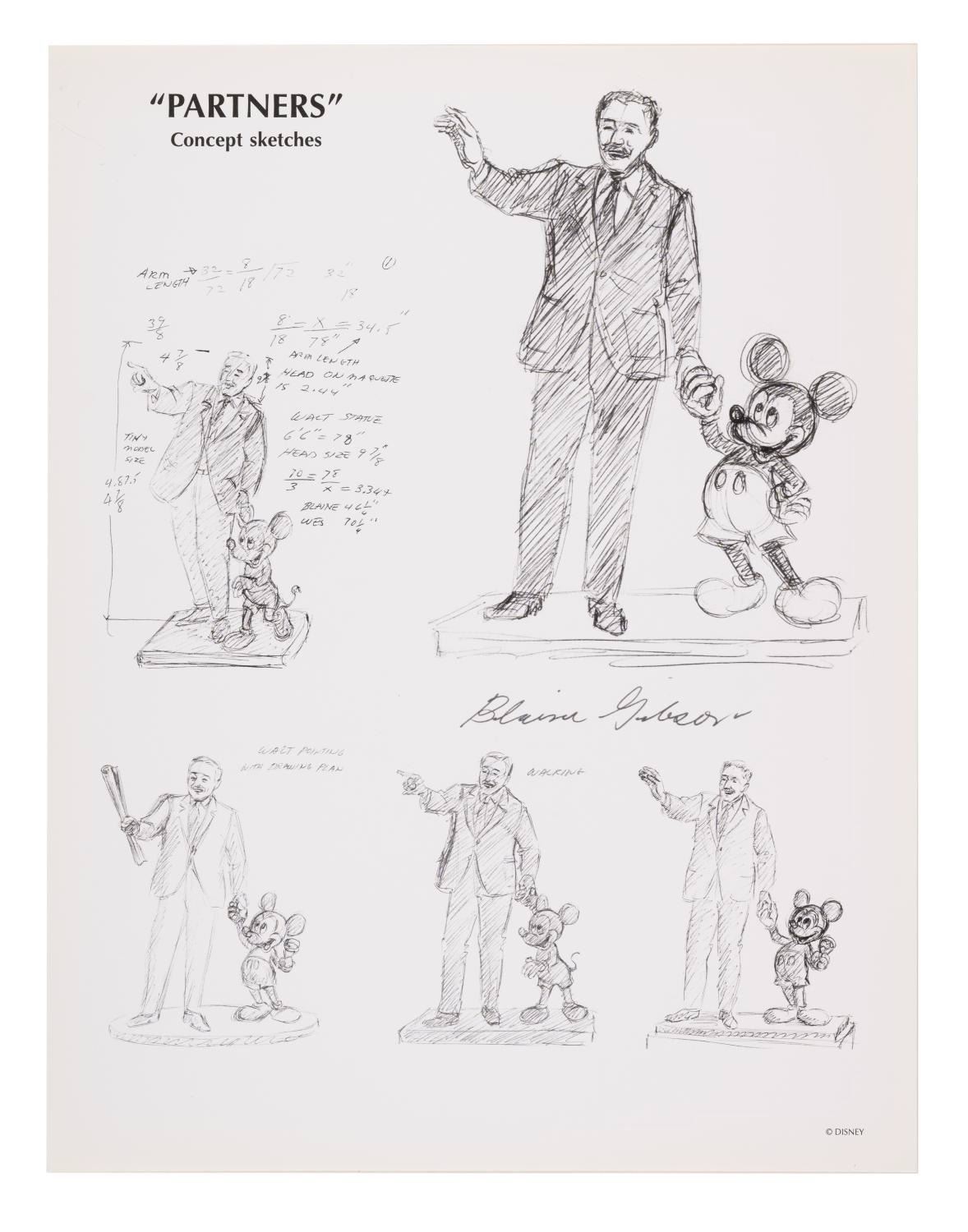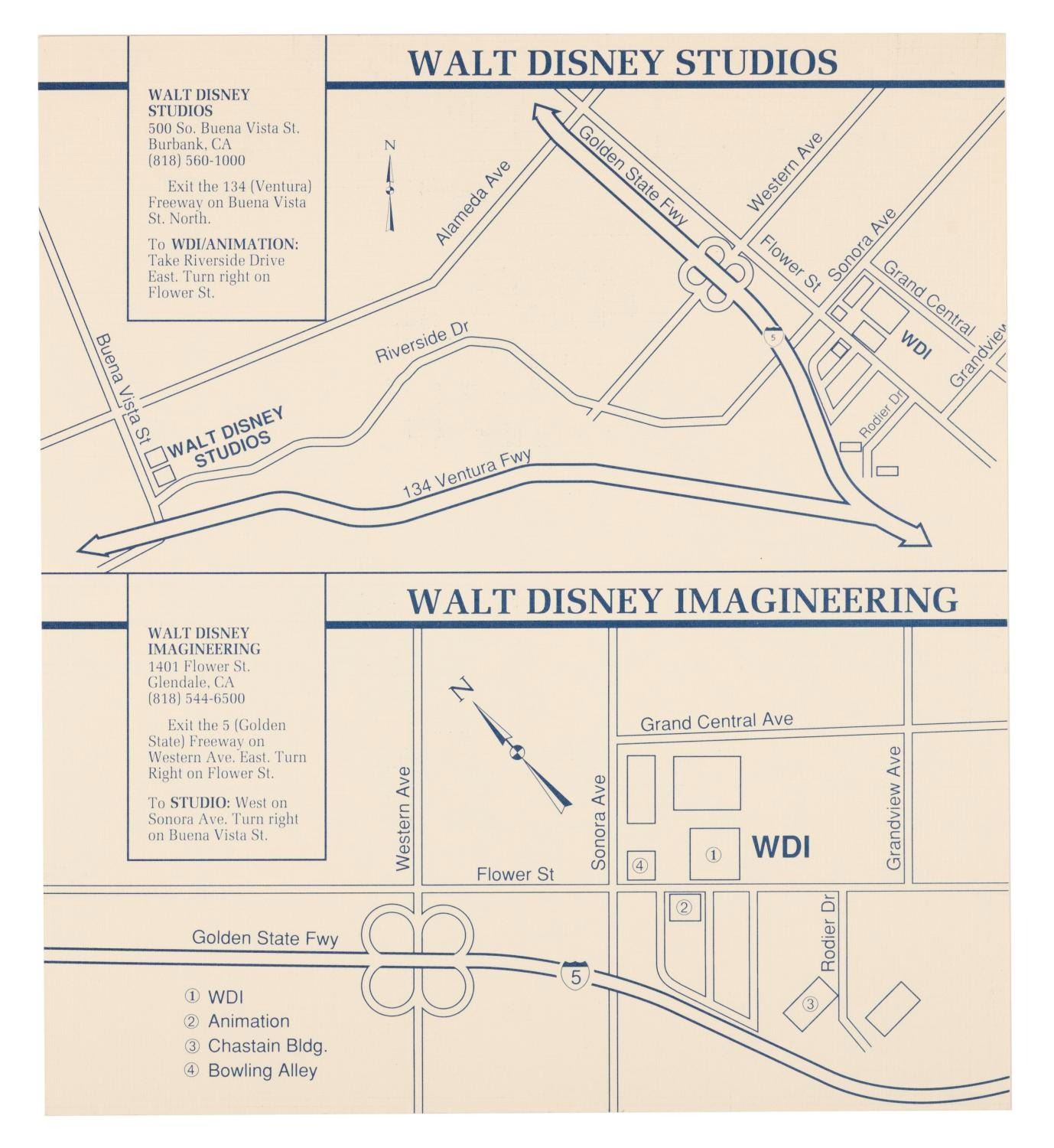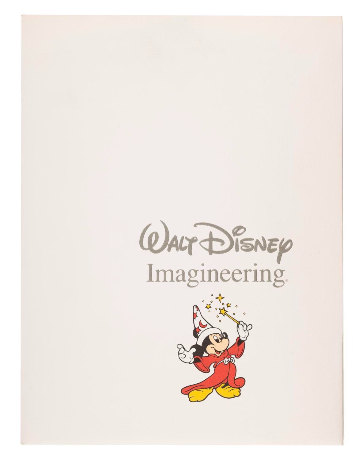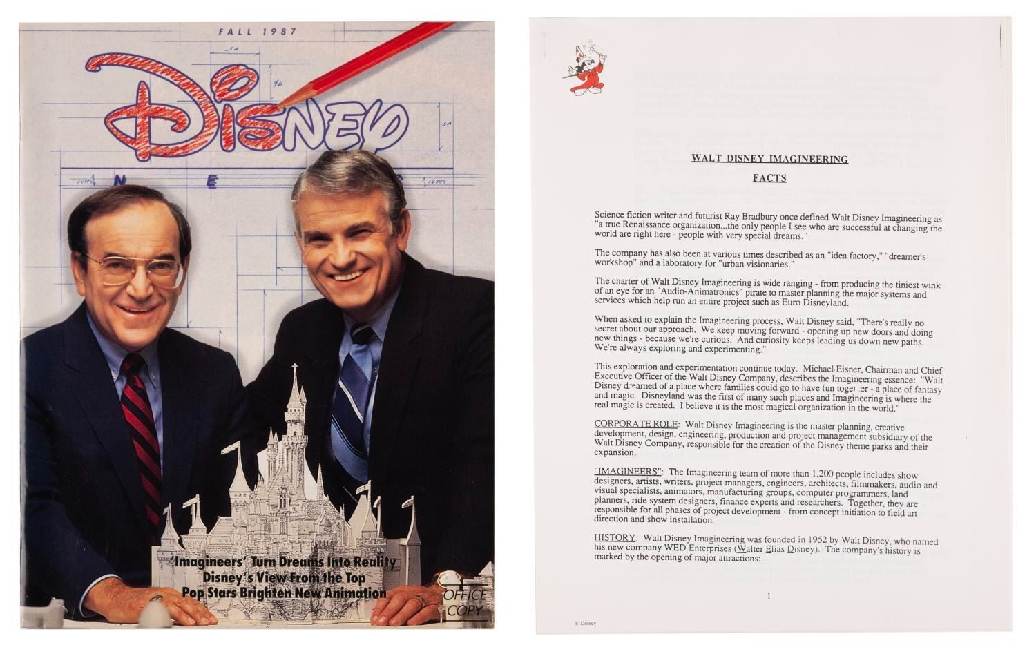 (Walt Disney Imagineering, 1980s) A Walt Disney Imagineering employment package including an article on Imagineering facts, a 1987 Disney News magazine, a Blaine Gibson "Partners" statue concept art print, a history of Imagineering pamphlet, a career opportunities flyer, a map card with directions to Disneyland, the Walt Disney Studios, and Walt Disney Imagineering, and an Imagineering Ethics & Values booklet. The folder measures 9" x 12", and it and the contents are in very good condition with light wear from use.