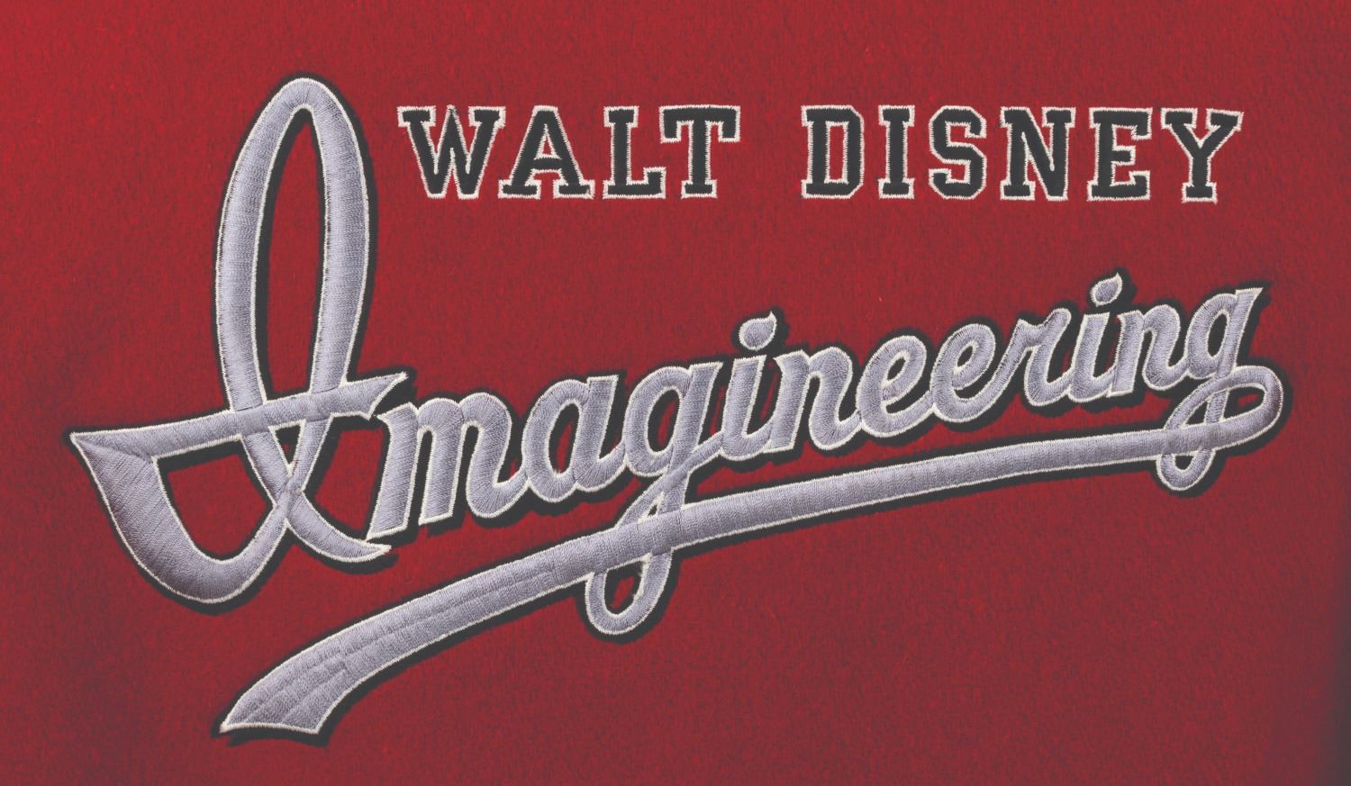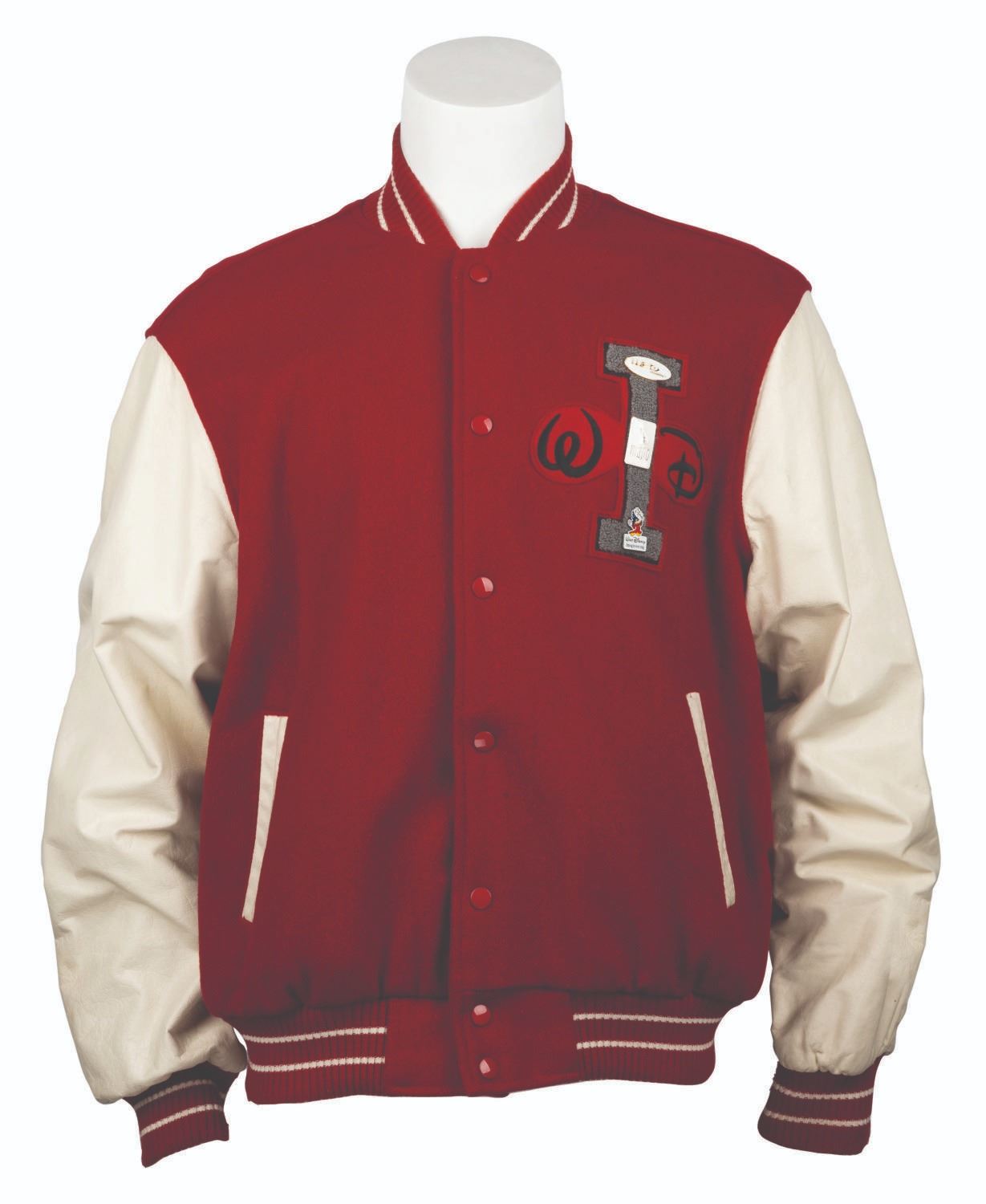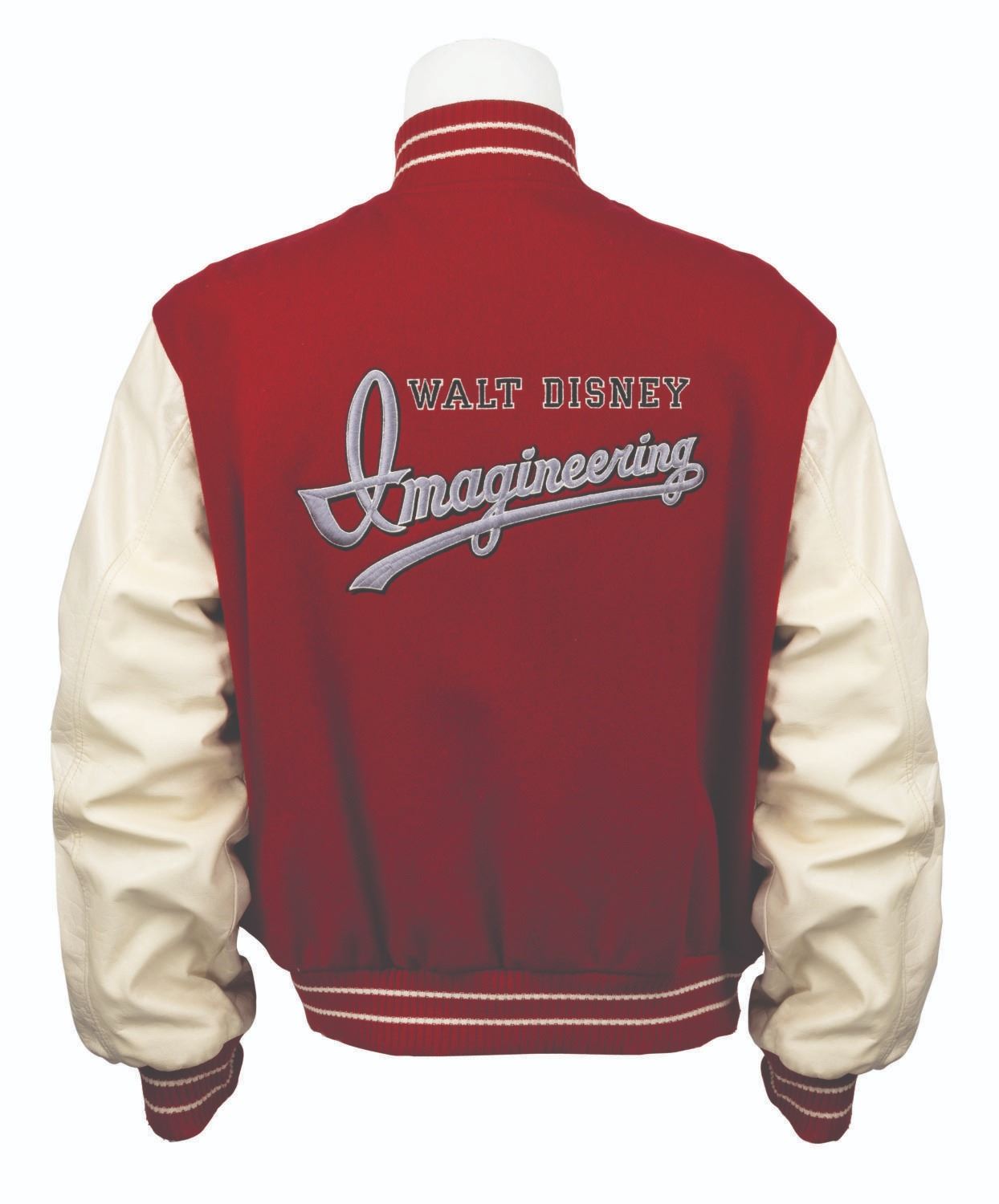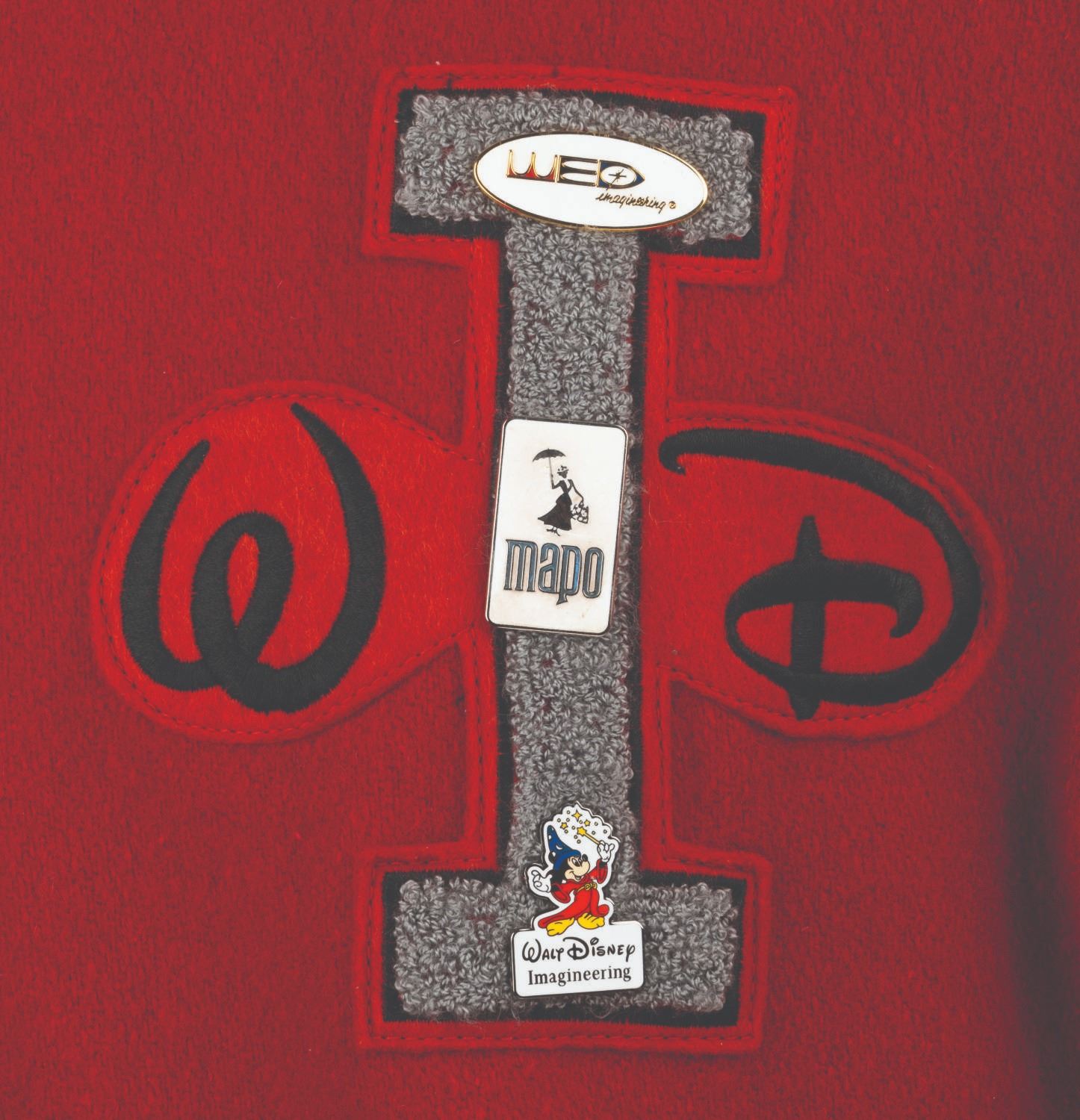 (WDI, 1990s) A Walt Disney Imagineering letterman jacket with an embroidered “WDI” patch and three bonus cloisonne pins featuring the MAPO, Walt Disney Imagineering Sorcerer, and classic WDI logos. Measuring a size “X-Large,” the wool shell jacket with leatherette sleeves is in very good condition with light wear from use including small scuffs on the left shoulder and slight discoloration.