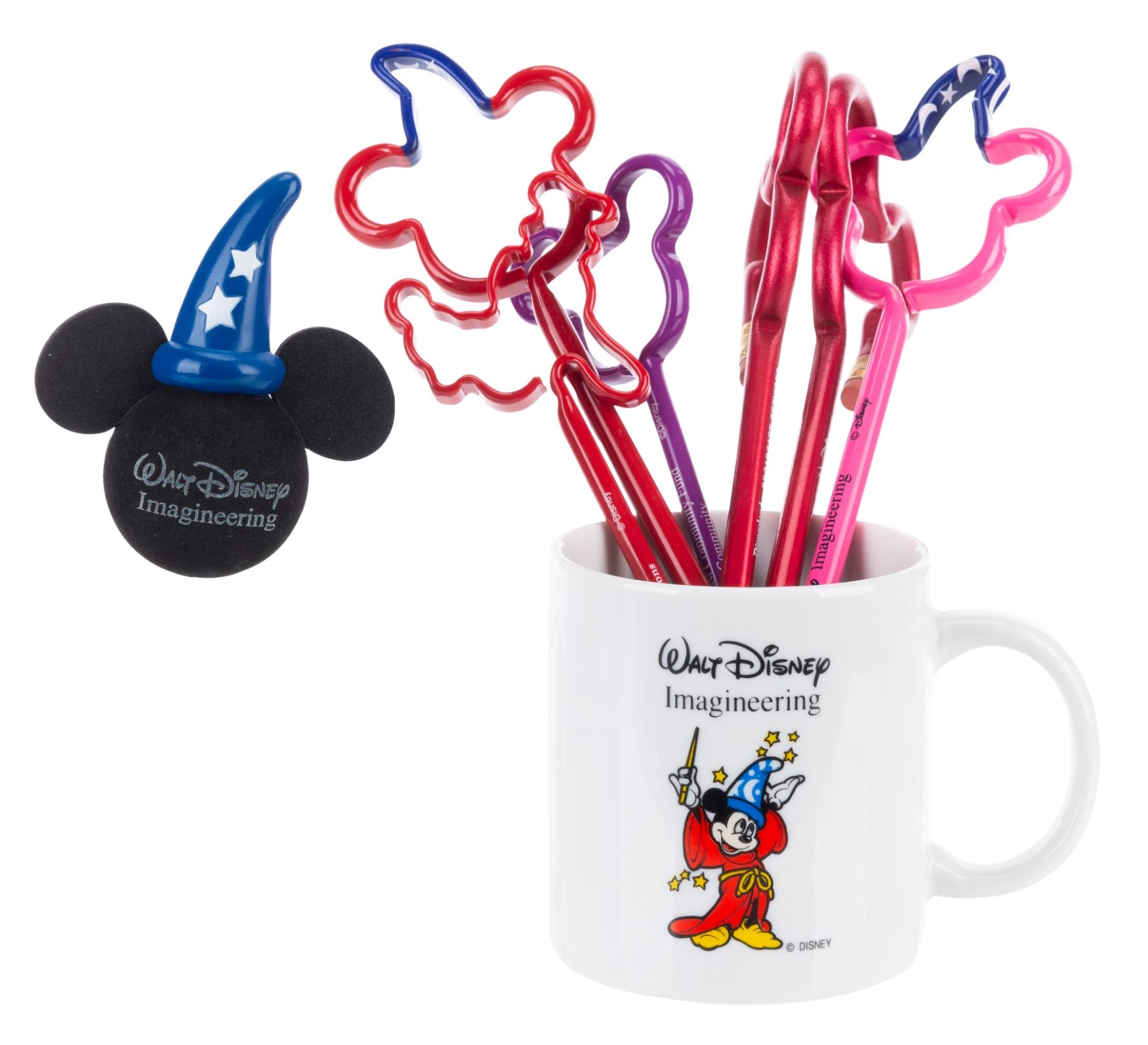 A Walt Disney Imagineering Mug, Pens, Pencils, & Antennae Topper.