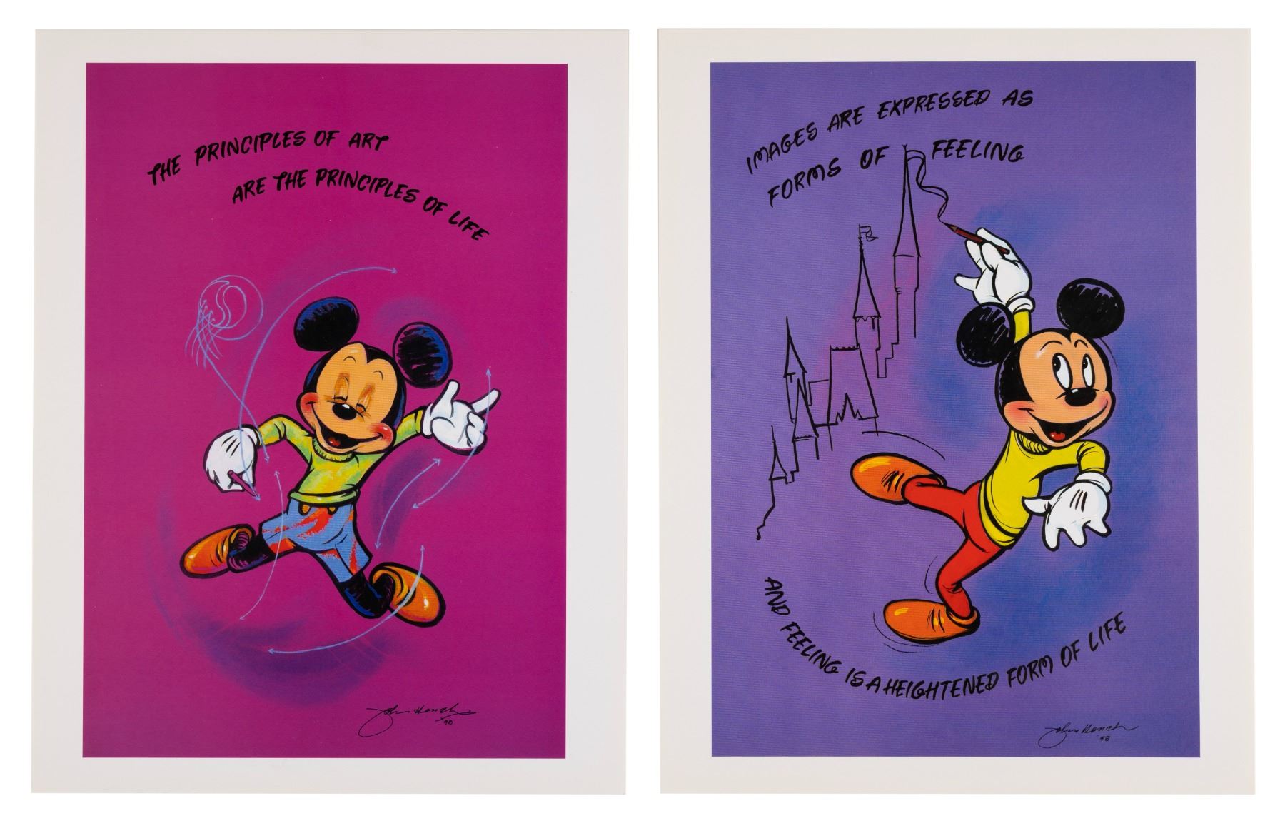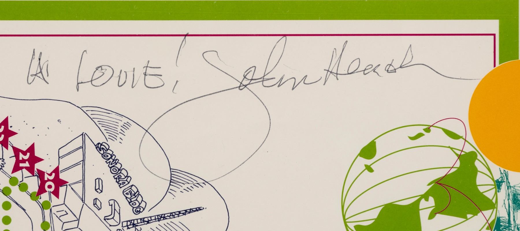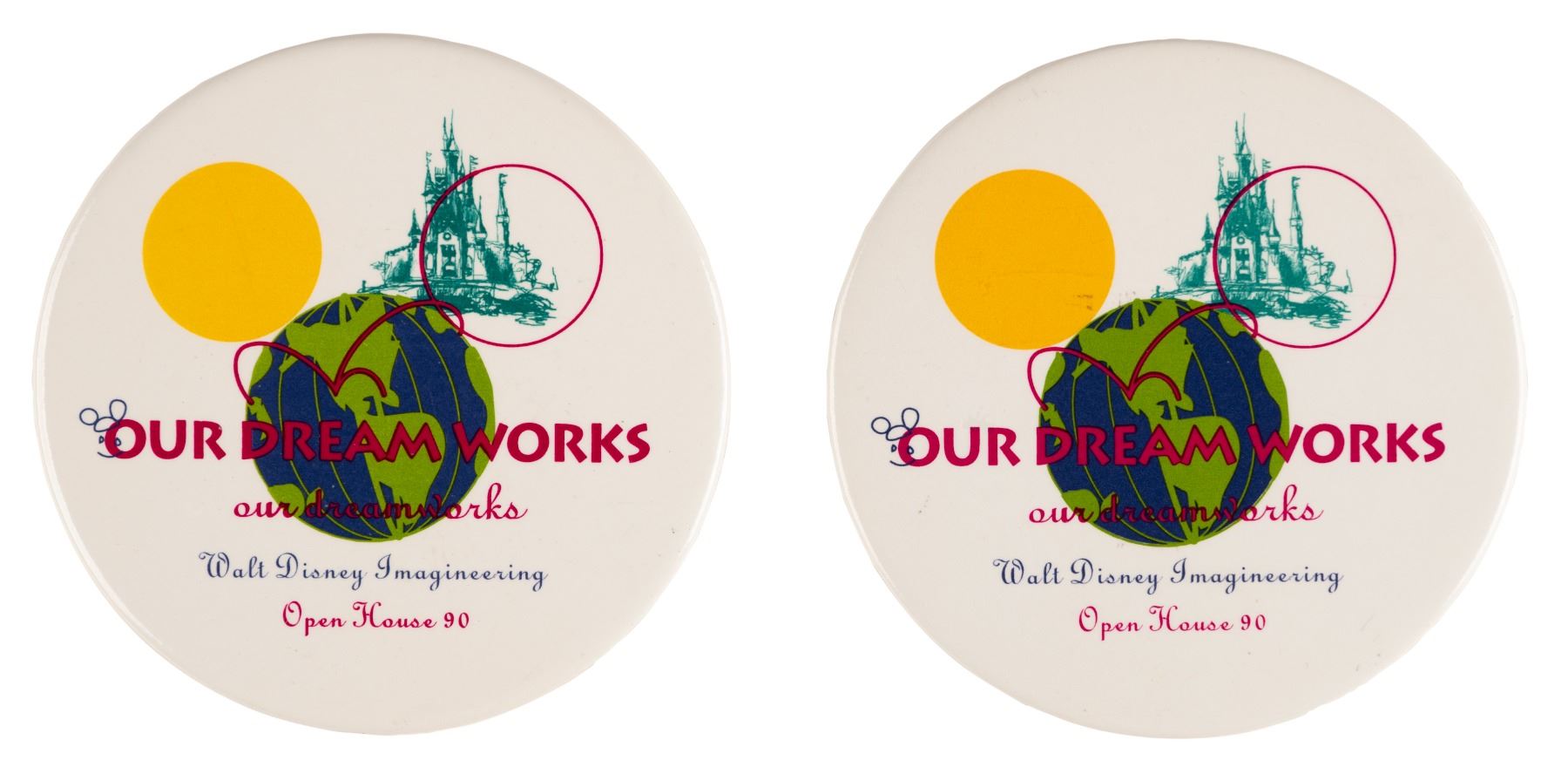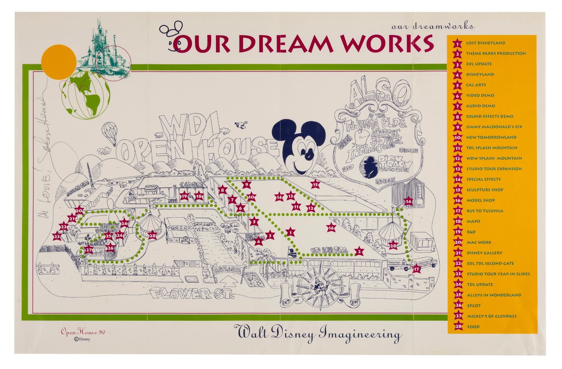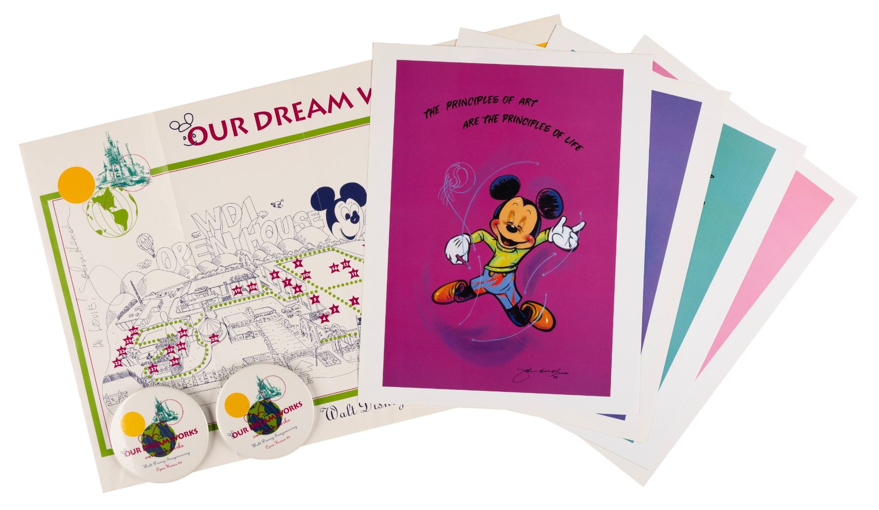 (Walt Disney Imagineering, 1990) A collection of souvenirs from the Walt Disney Imagineering Open House. Included are an Imagineering Studio Map and five motivational prints designed by John Hench, and two pinback buttons. The map is hand-signed in ink by Hench to "Louie."  Measuring from 3" in diameter to 17" x 11", the items are in fine to very good condition with light scratching and oxidation to the reverse of the buttons. The map is in good condition with some warping around the bottom right and light creasing.  Est.  Opening Bid: $20.00