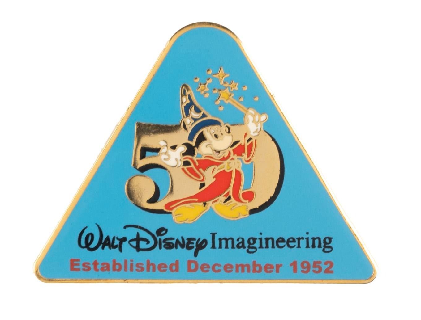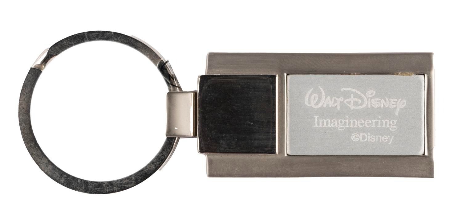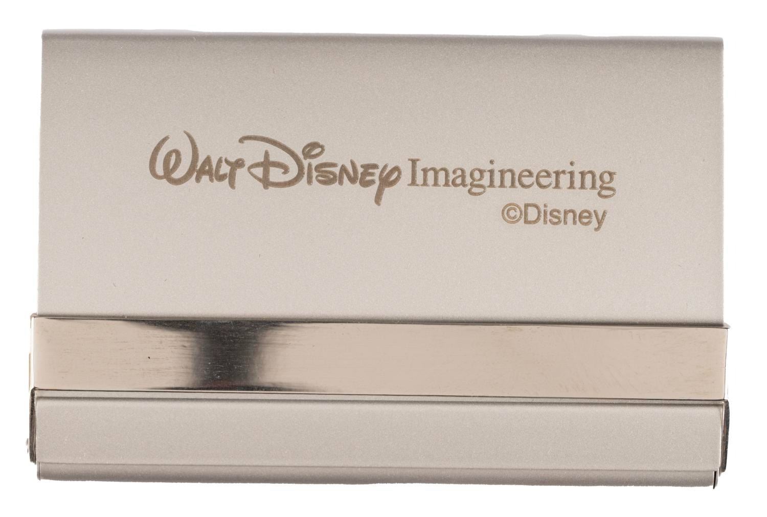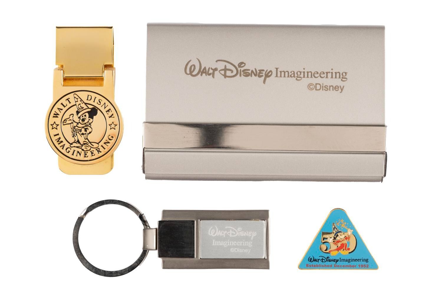 (Imagineering, 1990s-2000s) A Walt Disney Imagineering souvenir collection. These exclusive products include a 50th anniversary pin, cardholder, keyring, and money clip. The pin measures 1.25"x1", the cardholder is 3.75"x2.5", the keyring is 3.25"x1.25", and the money clip is 1.25"x2.25". The pieces are from very good to fine condition, some with light wear.