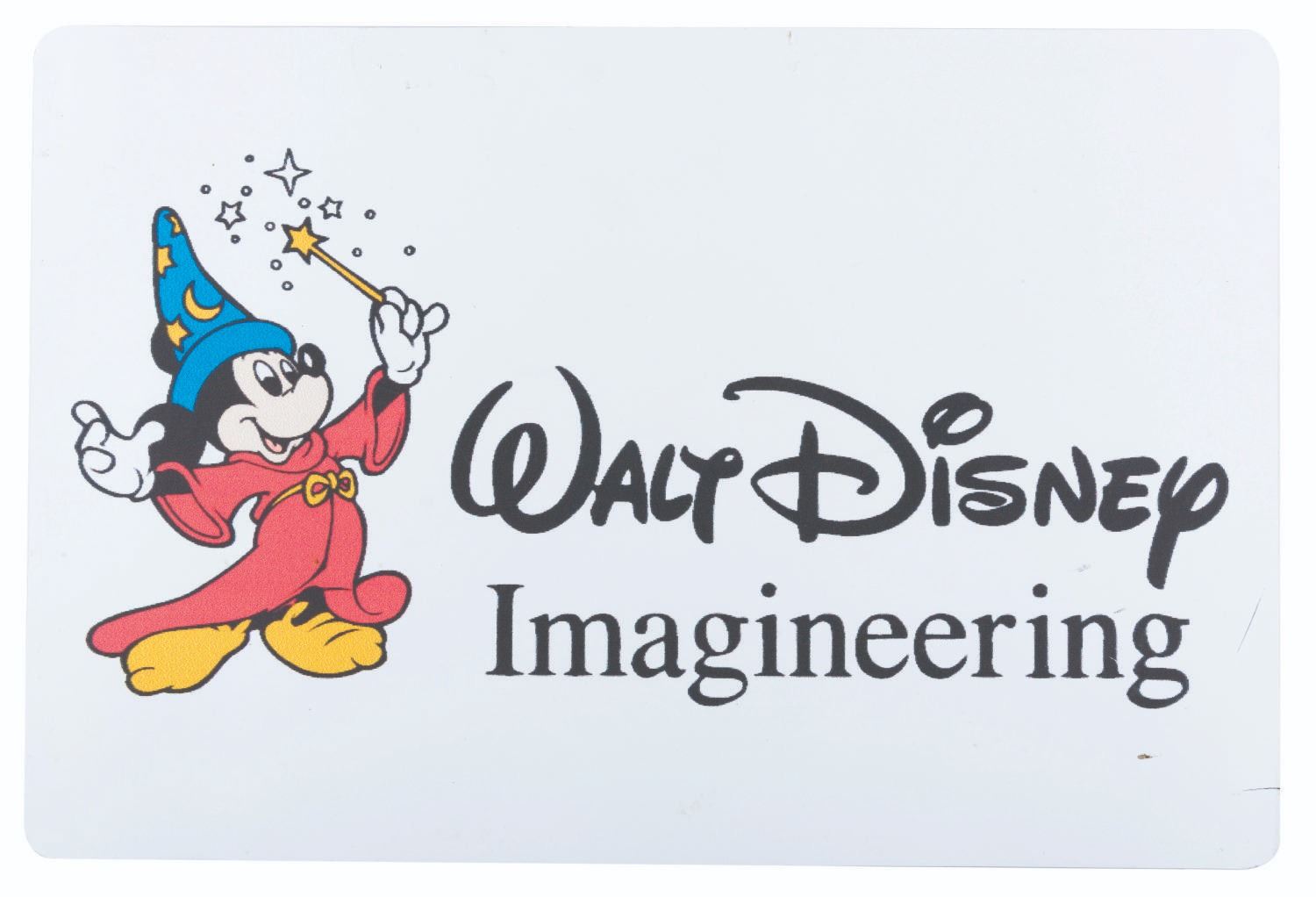 (Disney, 1990s-2000s) A large magnetic sign with the Walt Disney Imagineering logo, placed on vehicle doors or sides. These would usually be seen in backstage areas of the Disney Parks or Studio to identify working vehicles. Measuring 12" x 18", the vinyl magnetic sign is in very good condition with typical wear from use, including a 0.5" tear in the bottom right edge, small scuffs, and velcro applied to the back for later non-magnetic display.