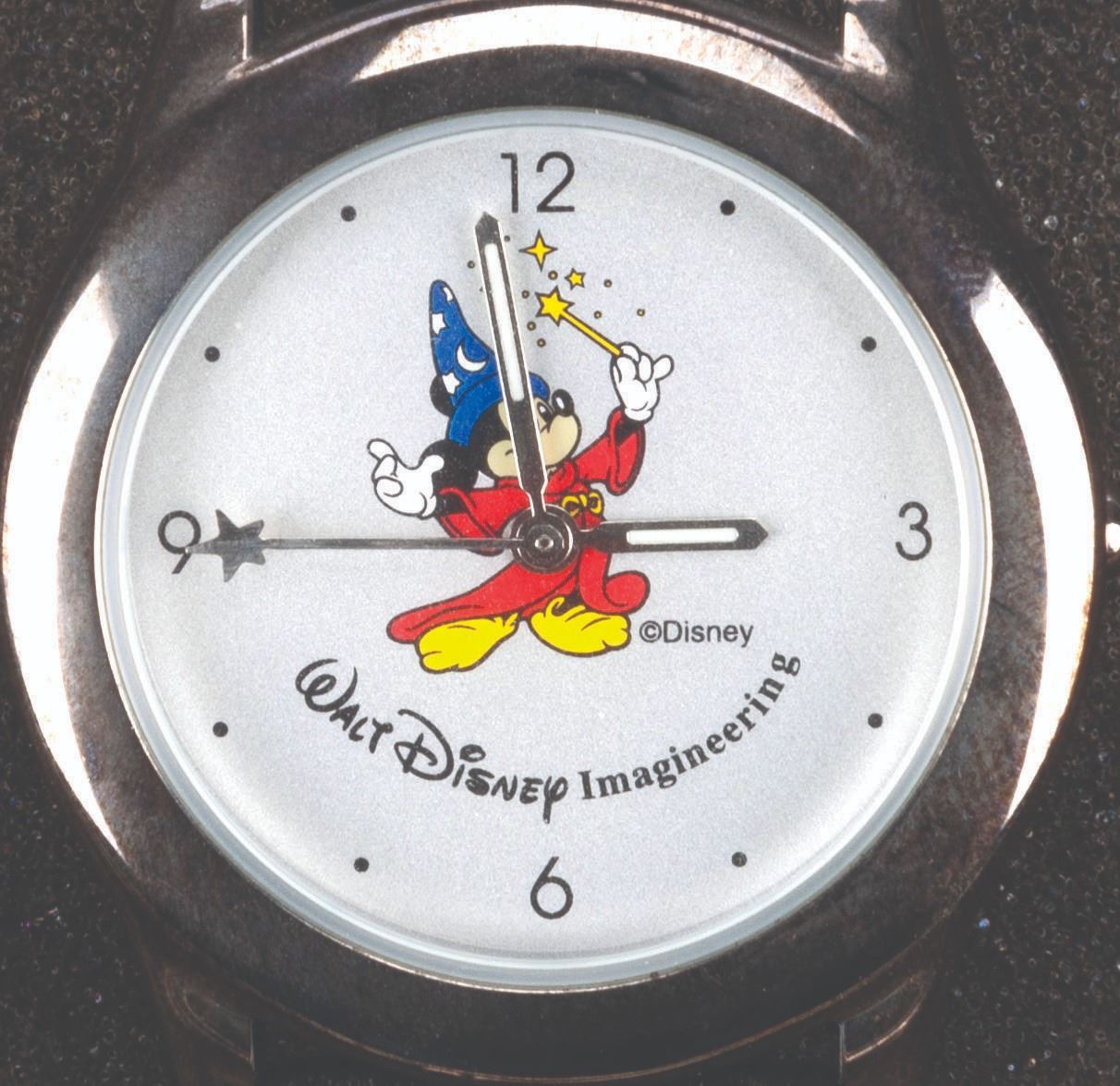 (Imagineering, 1990s-2000s) A Walt Disney Imagineering wristwatch featuring the Sorcerer's Apprentice Mickey Mouse. The watch requires a battery and service to function. Measuring 1.5" in diameter on a 9" long band, the watch is in very good condition with its 4" diameter x 2.5" tall tin.