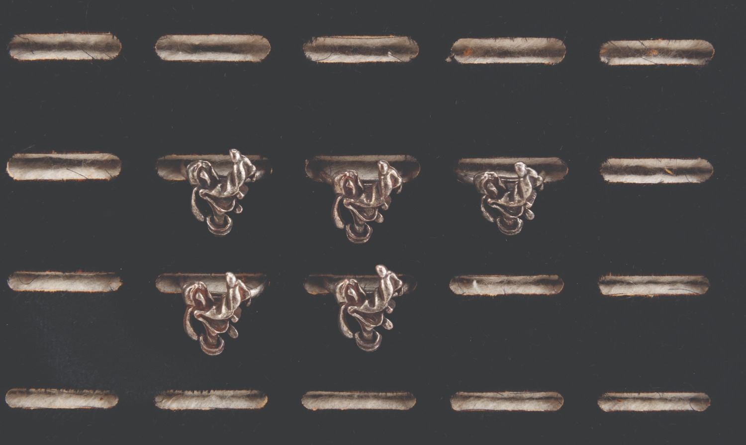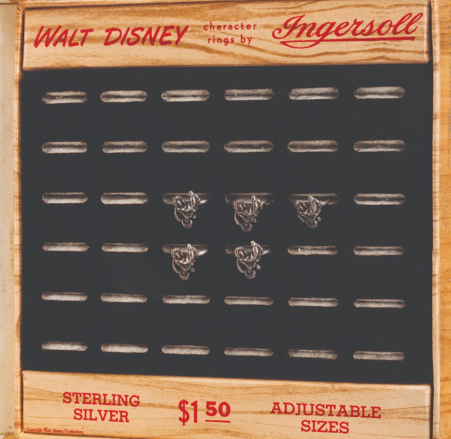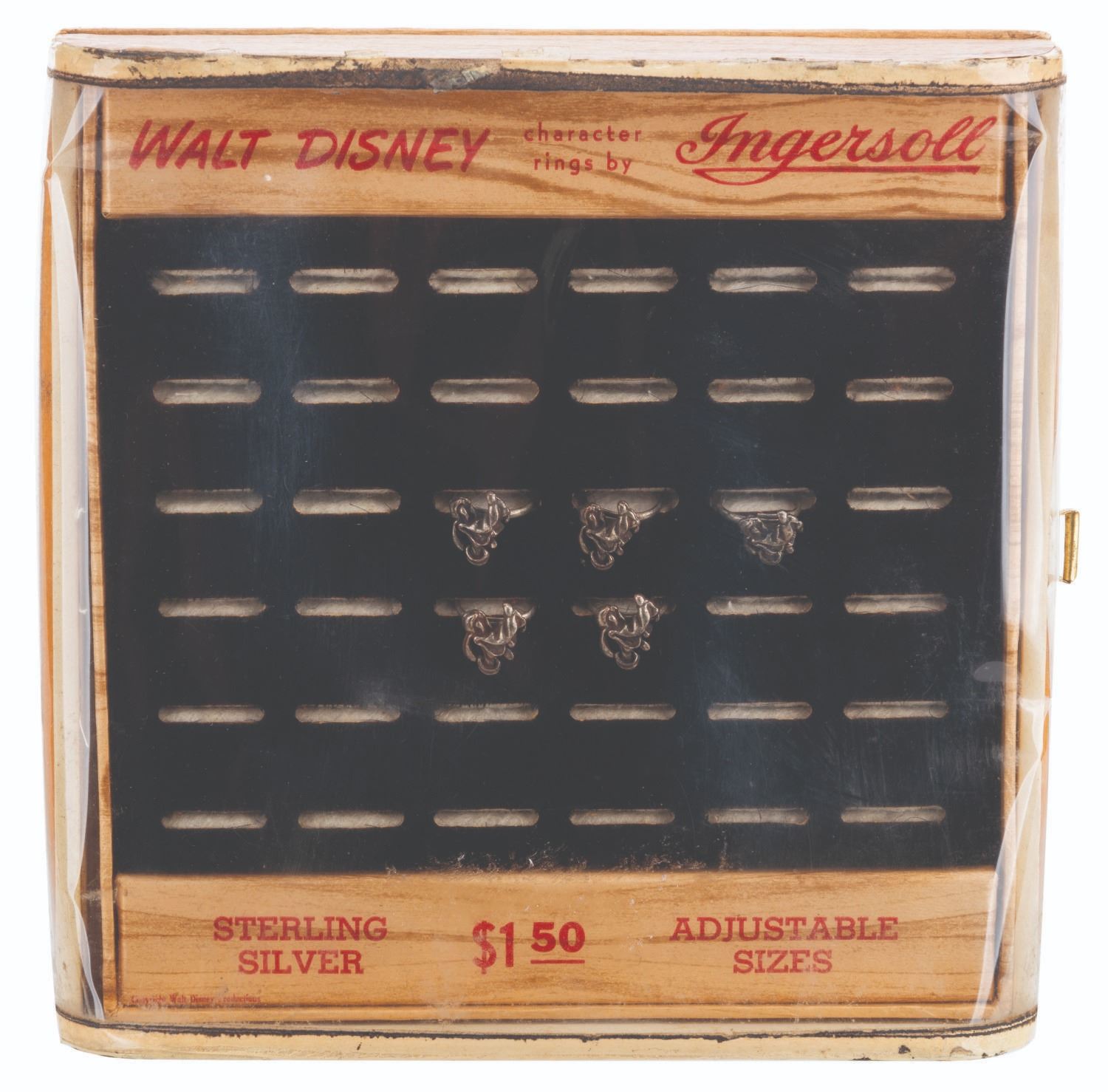 (Ingersoll, 1950s-60s) A Walt Disney Ingersoll countertop ring display, with five adjustable sterling silver Pluto rings. The display, designed to hold a total of 36 rings, is made from cardboard, with simulated wood grain covering, and a clear plastic hinged window with a metal handle. Measuring 8" x 8" x 1.75" deep, the display is in good condition with heavy wear and peeling along the edges and dents and scratches to the plastic window. The rings measure 0.75" in diameter and display in very good condition with light tarnish.