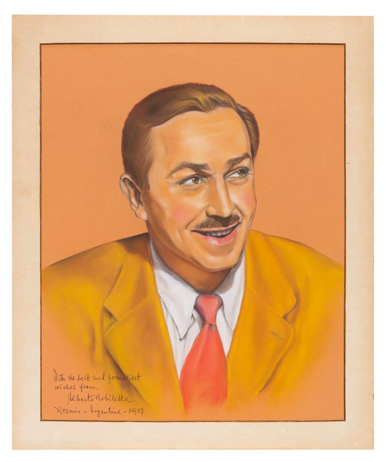 (1957) A hand-drawn portrait of Walt Disney with a dedication from Alberto Robilolta of Rosario, Argentina. Measuring 16.5 " x 18 " on a 16.5 " x 20.5 " visible art board in a 19.75 " x 23.75 " matte. The piece is accomplished in pastels and is in very good condition with light spots and smudges. The matte exhibits moderate discoloration and soiling.
