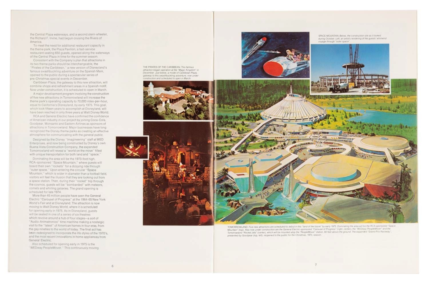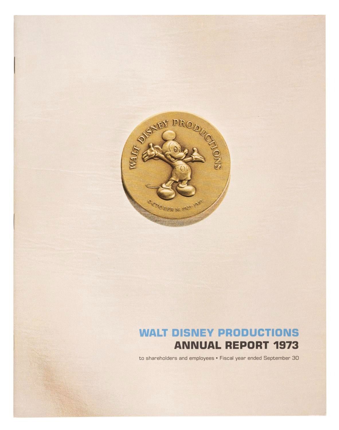 (Disneyland, 1973) An annual report summarizing the events and financial statements of Walt Disney Productions for the stockholders in 1973. This report features many photos and information regarding new attractions and happenings at the Parks and from the film division. This 40-page report measures 8.5" x 11” and is in very good condition with typical light handling wear.