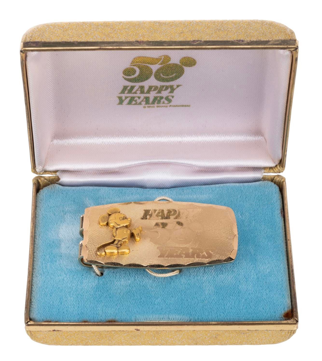 (Disneyland, 1973) A money clip created to commemorate the 50th anniversary of Walt Disney Productions. The money clip comes in the original decorative case which measures 2.5"x3.25" and 1" thick. The piece is in very good condition with minor oxidation visible on the metal rim around the case.