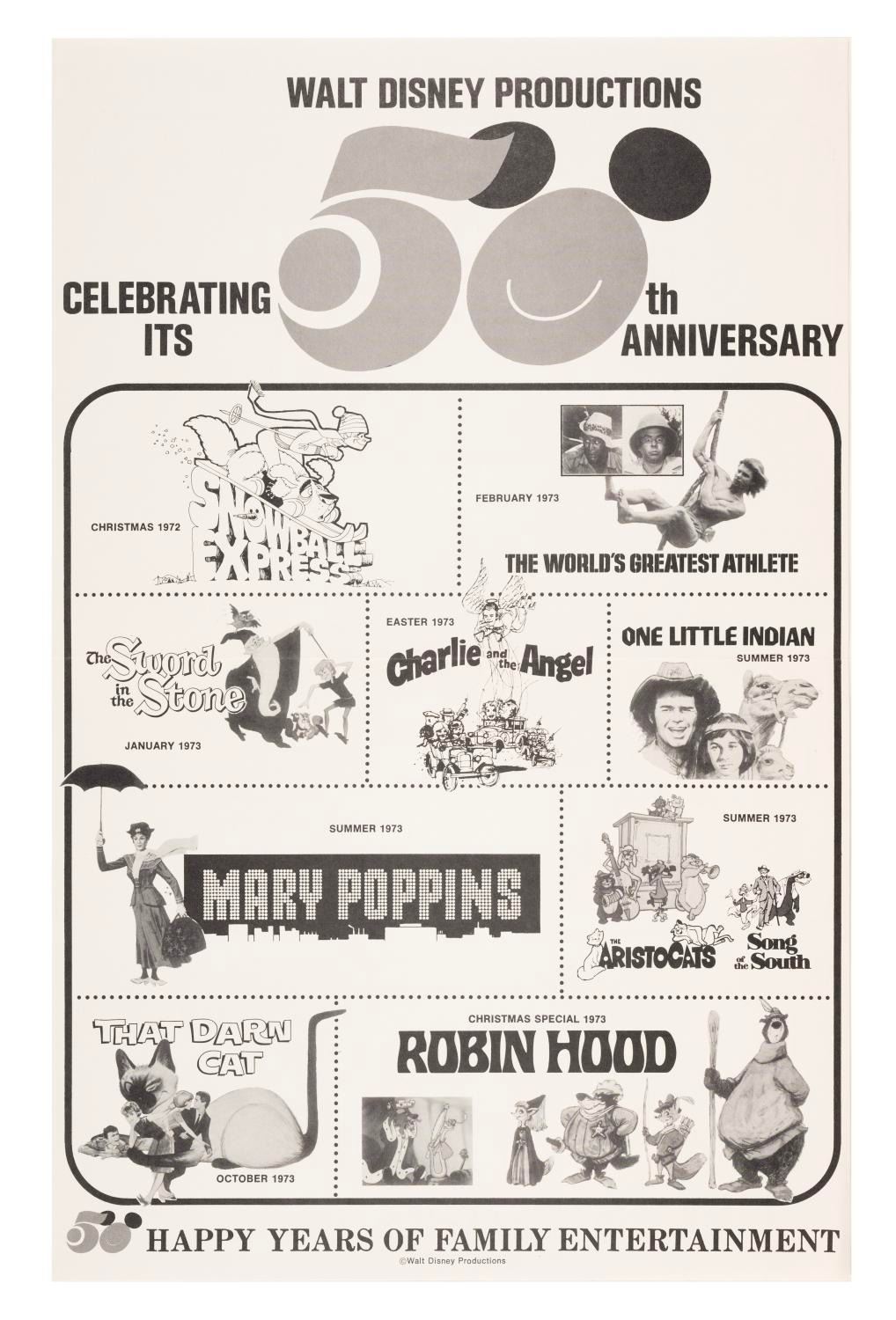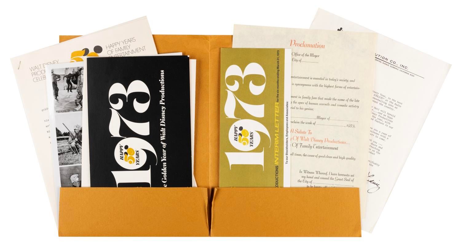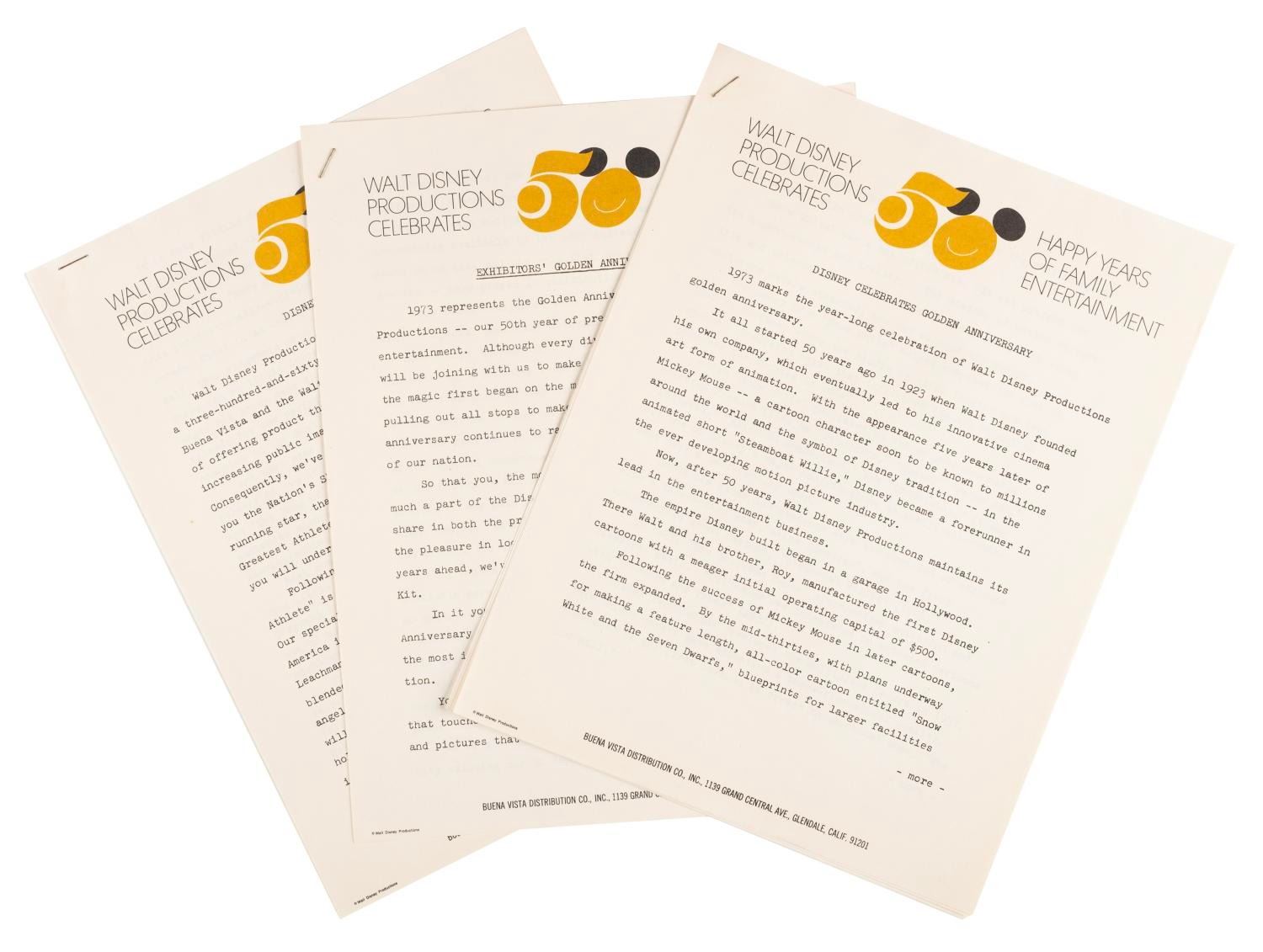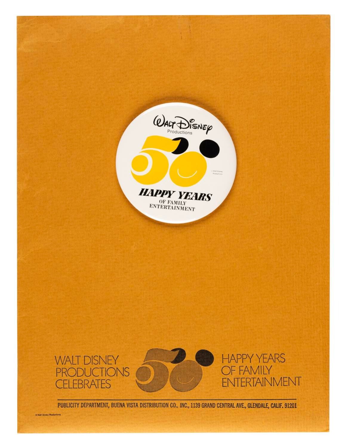 (Disney, 1973) A Walt Disney Productions press kit promoting upcoming motion pictures and the "Golden Anniversary" of the company. Included are a sheet of logos for reproduction, a blank certificate for mayors declaring "A Salute to the 50th Anniversary of Walt Disney Productions," and other promotional materials. The entire kit comes within a "50 Happy Years" folder with a button attached. Measuring 8.5"x11" and under, each piece is in very good condition in its 9"x12" folder, exhibiting some handling and surface wear.