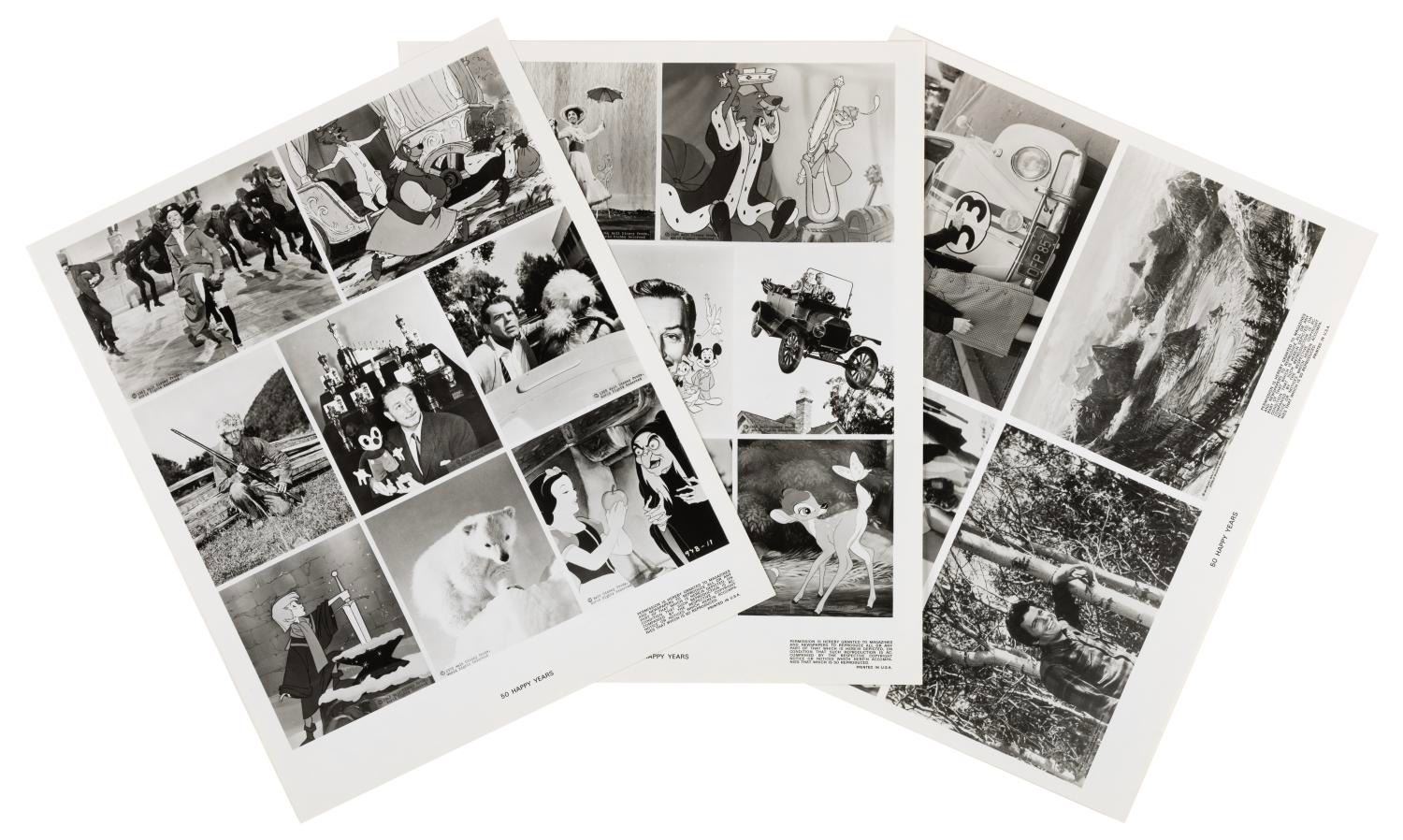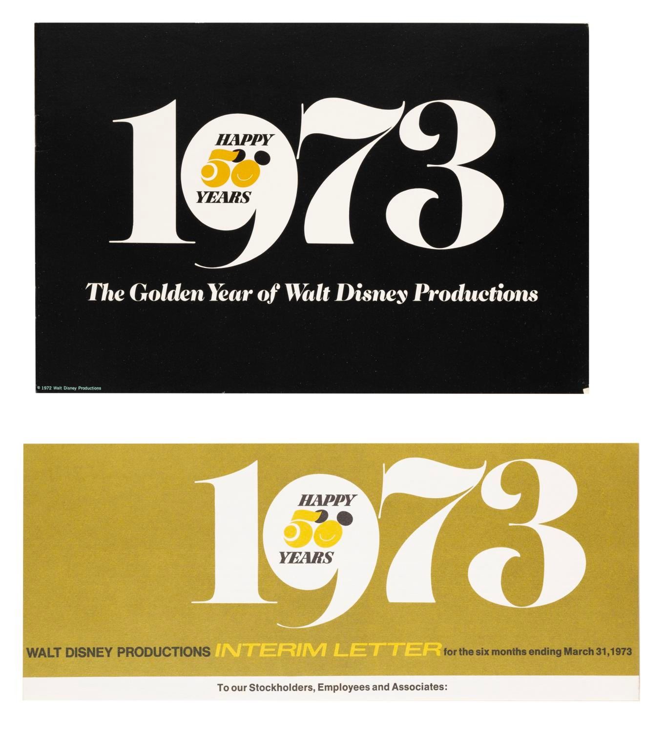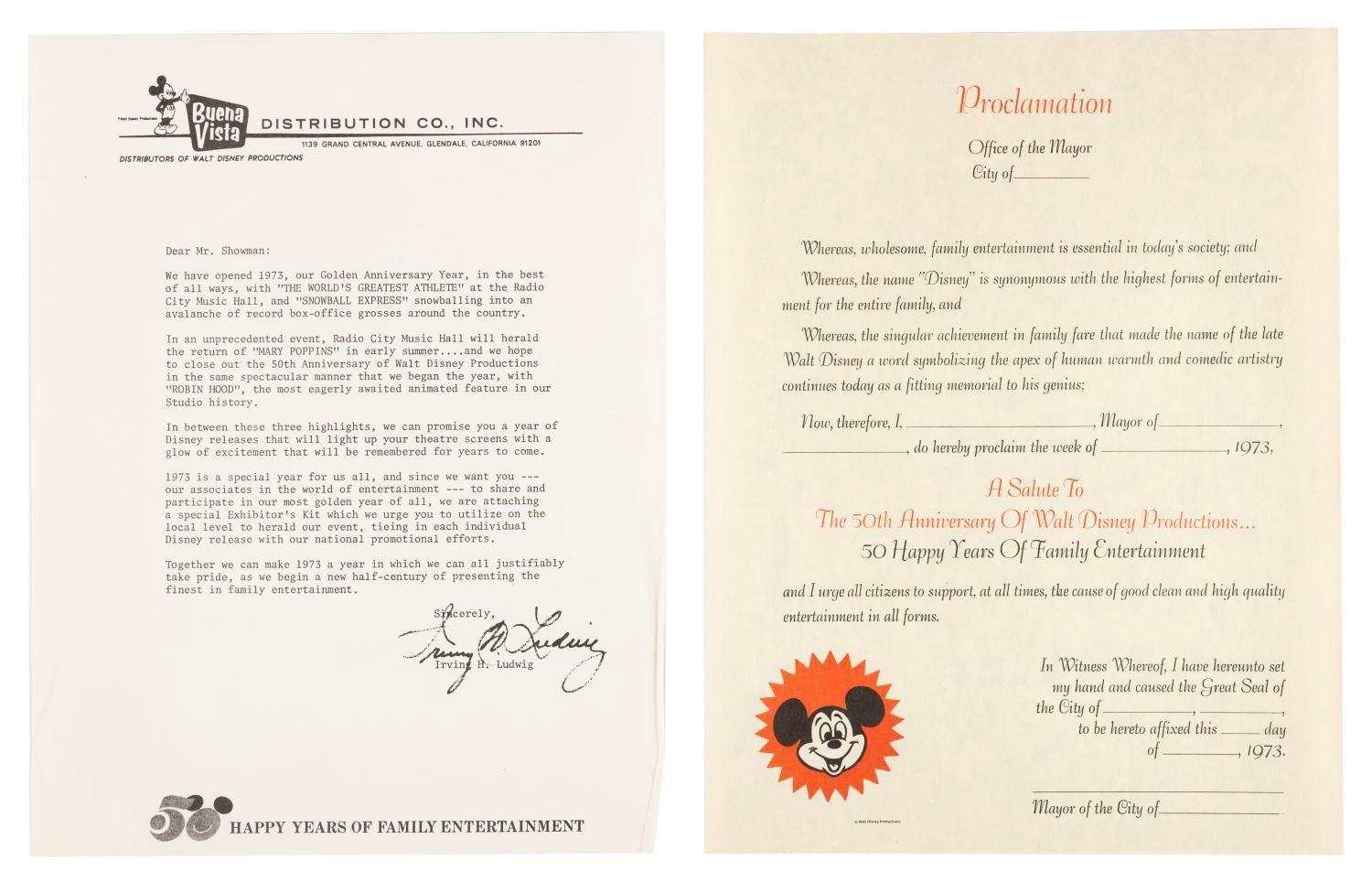 (Disney, 1973) A Walt Disney Productions press kit promoting upcoming motion pictures and the "Golden Anniversary" of the company. Included are a sheet of logos for reproduction, a blank certificate for mayors declaring "A Salute to the 50th Anniversary of Walt Disney Productions," and other promotional materials. The entire kit comes within a "50 Happy Years" folder with a button attached. Measuring 8.5"x11" and under, each piece is in very good condition in its 9"x12" folder, exhibiting some handling and surface wear.