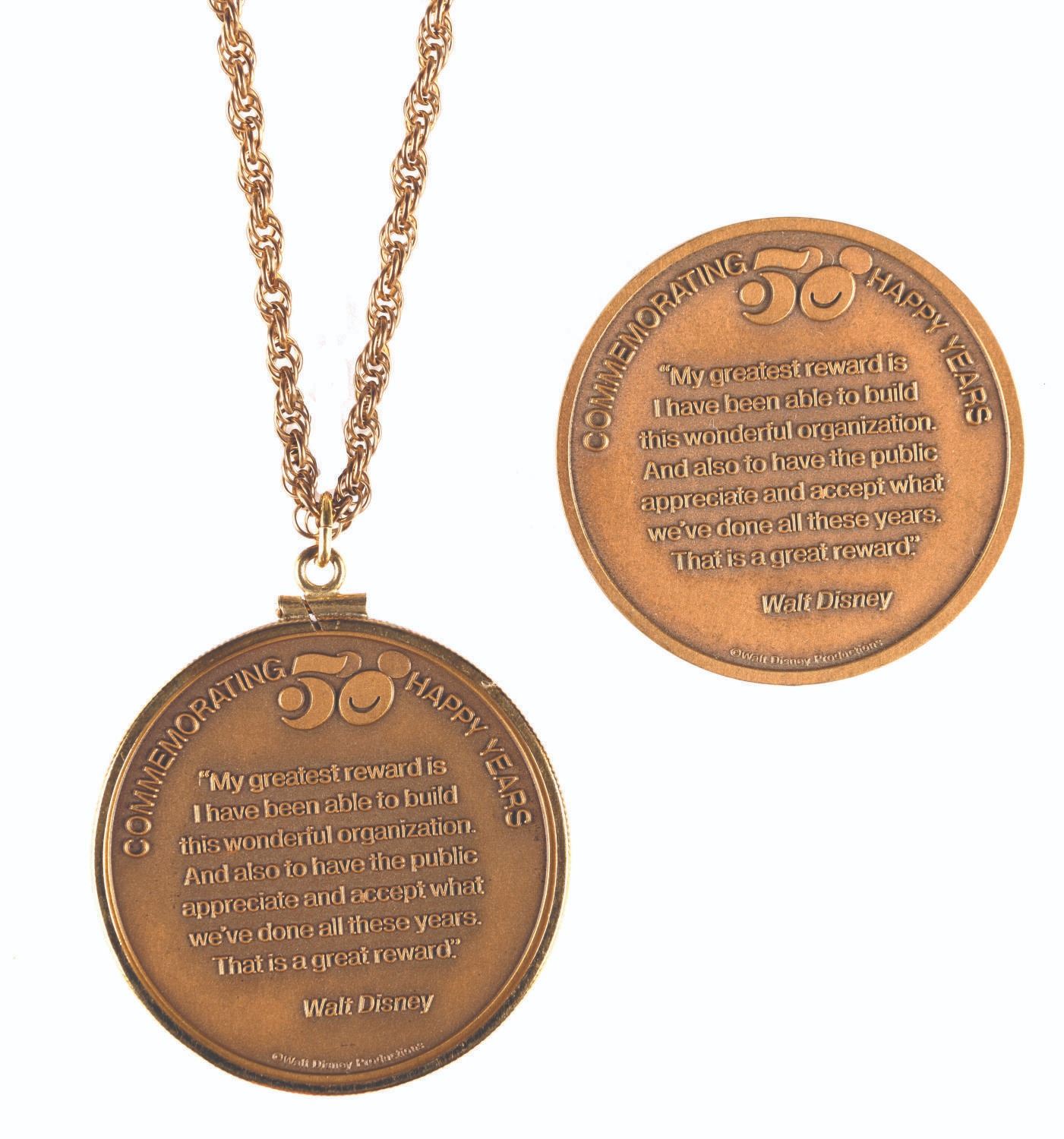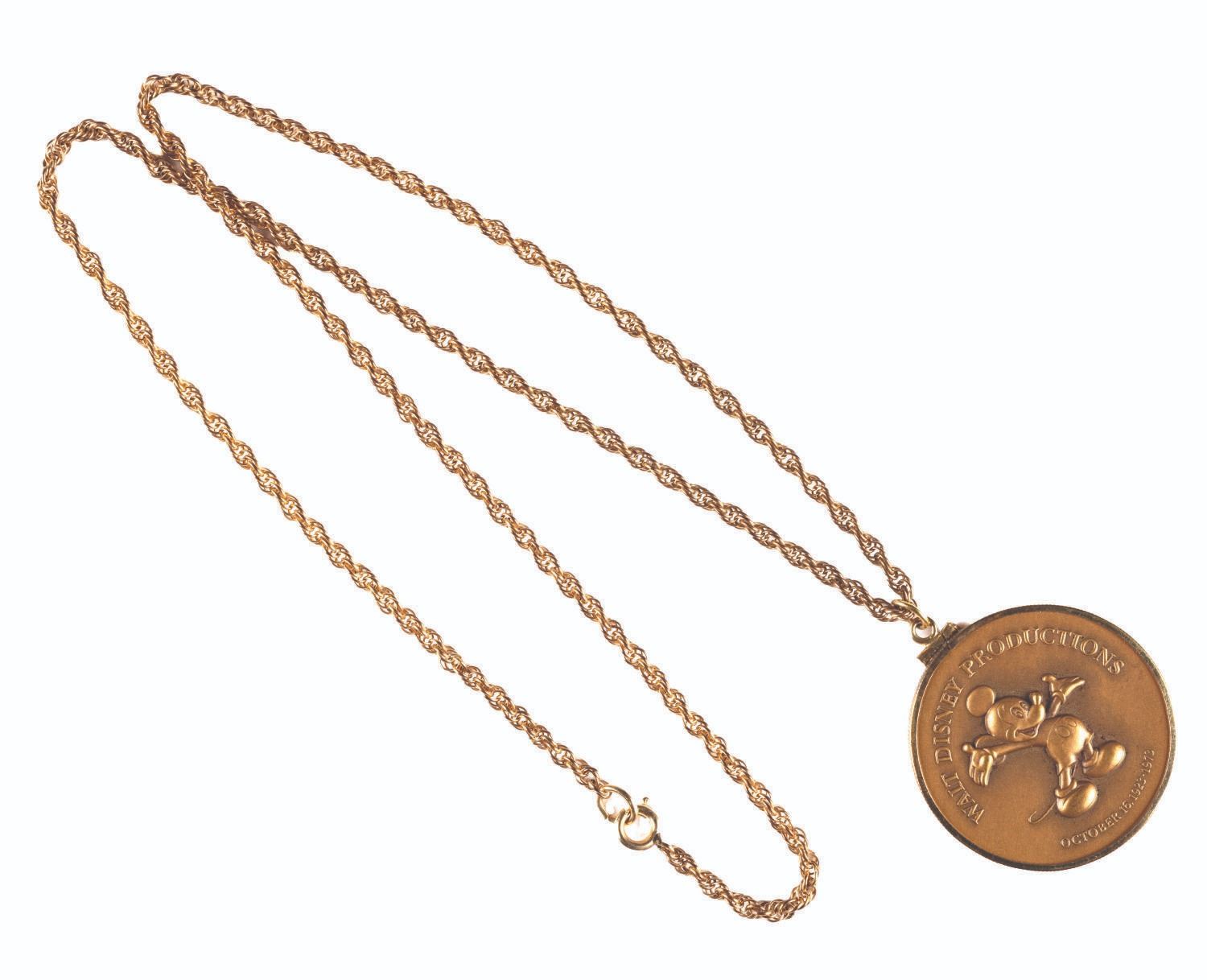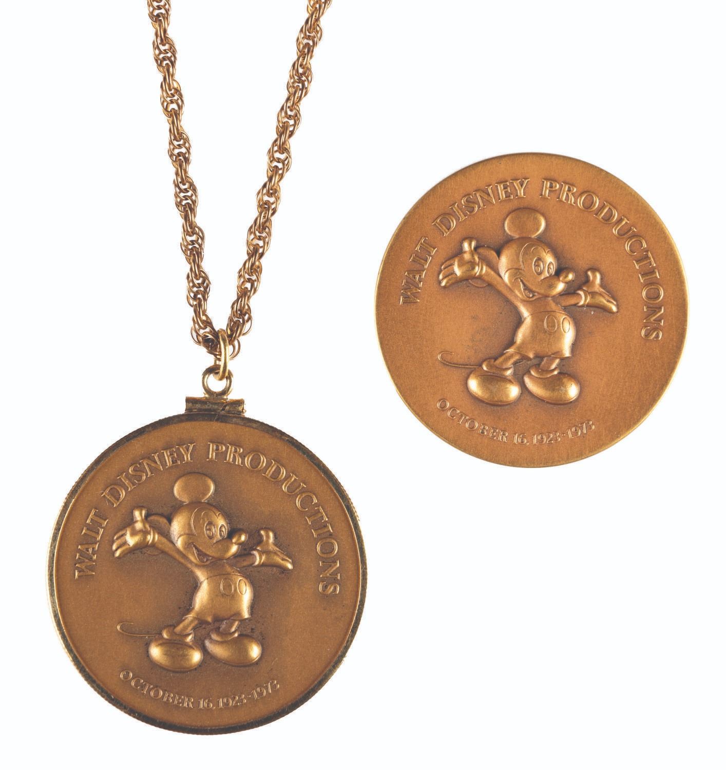 (Disney, 1973) A Walt Disney Productions Cast Member exclusive medallion and necklace commemorating the Company's 50th anniversary. The medallion measures 1.5" in diameter, the necklace measures 12" in length. Both pieces are in fine condition with minimal tarnishing.