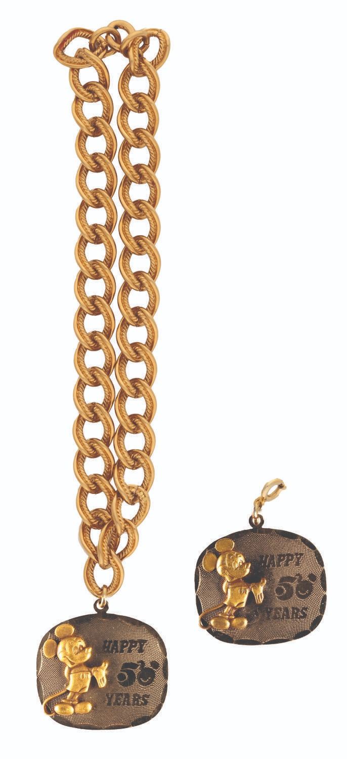 (Disneyland, 1973) A bracelet and pendant created to commemorate the 50th anniversary of Walt Disney Productions. The bracelet measures 5" in length and the pendant measures 1" in diameter. Both pieces are in fine condition with light surface wear on the reverse of the pendant.