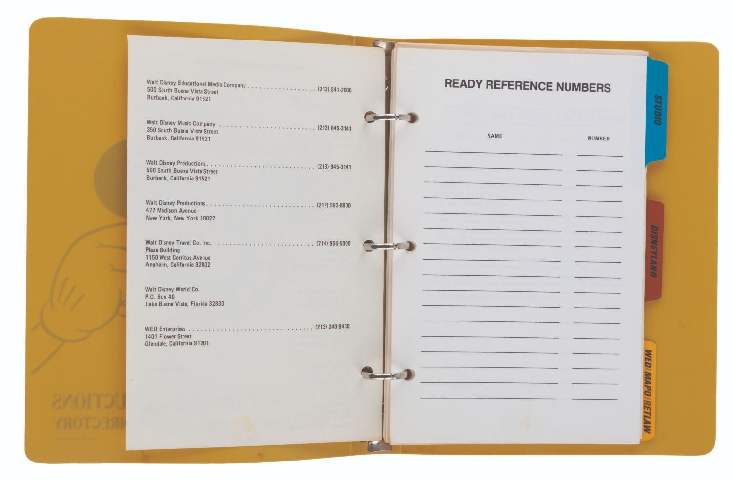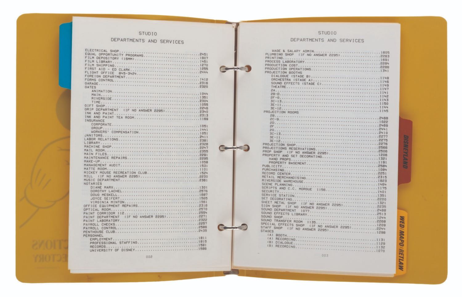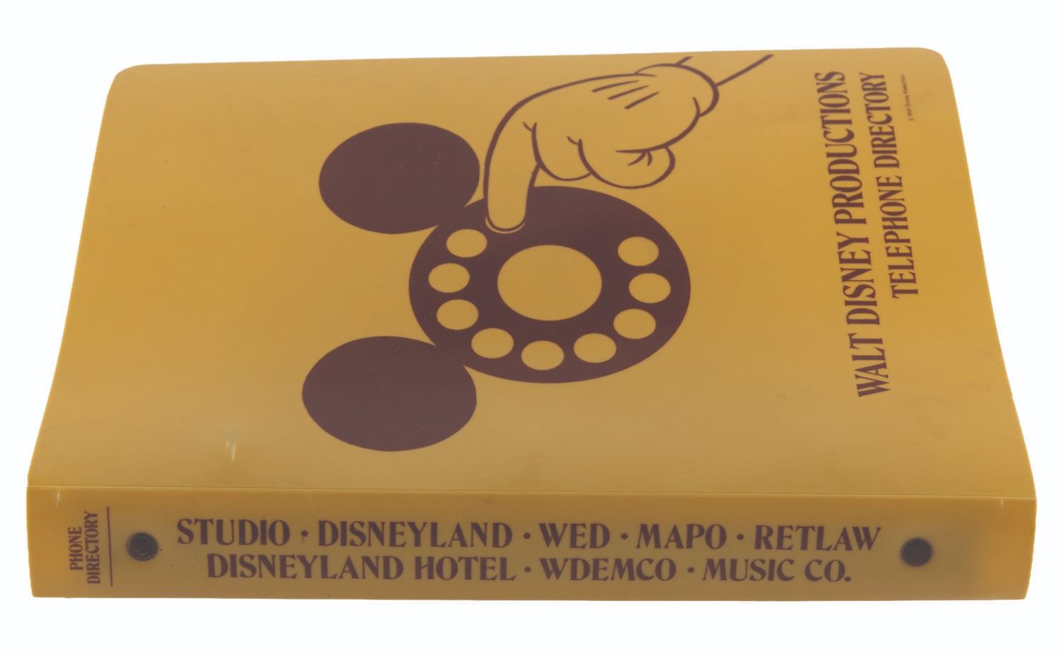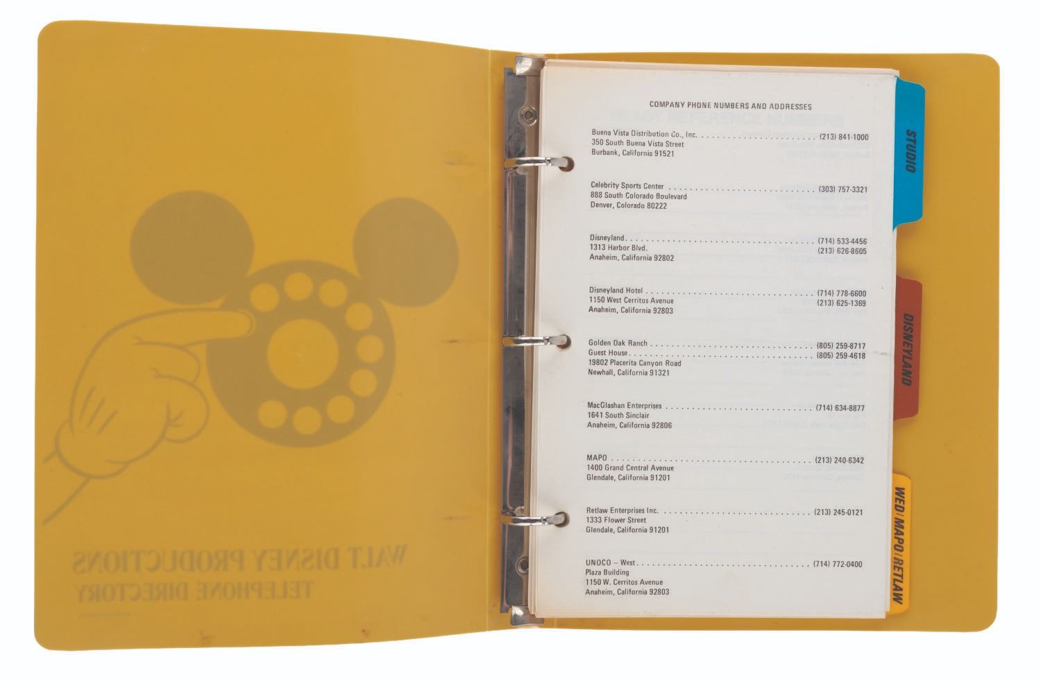 (Disneyland, 1970s) A Walt Disney Productions telephone directory. The three-ring binder includes 71 numbered pages (and many unnumbered) of phone extensions, addresses, and other contact information for the employees of Disneyland, Walt Disney Studios, and WED/MAPO/RETLAW. Notable extensions listed include Disney Legends Wally Boag, Tony Baxter, and Martha Blanding. Measuring 9" x 7" x 1", the directory is in very good condition with light wear from use, including a stress mark in the cover from the metal ring inside.