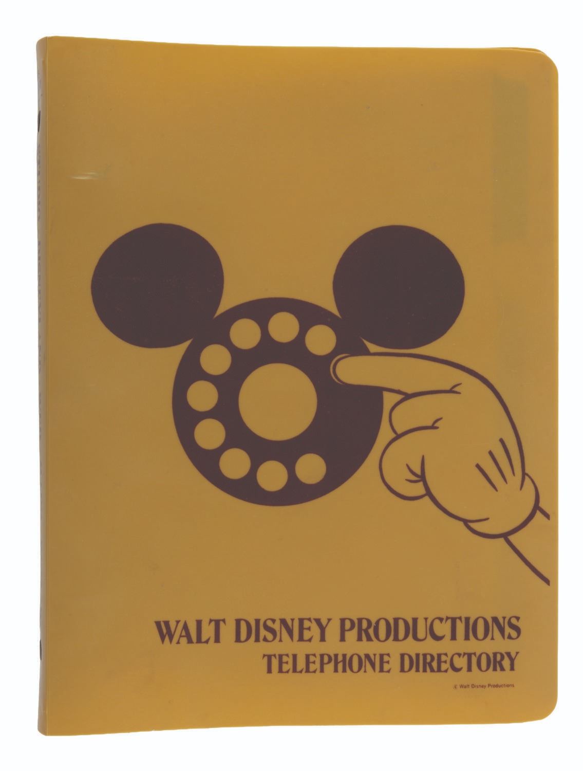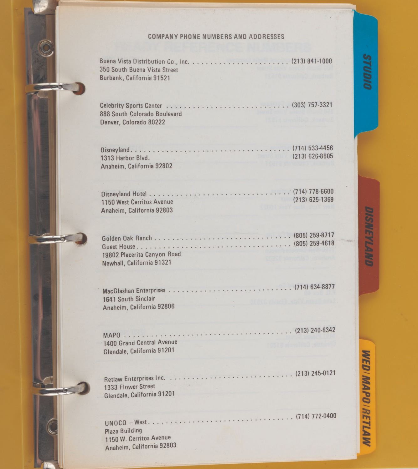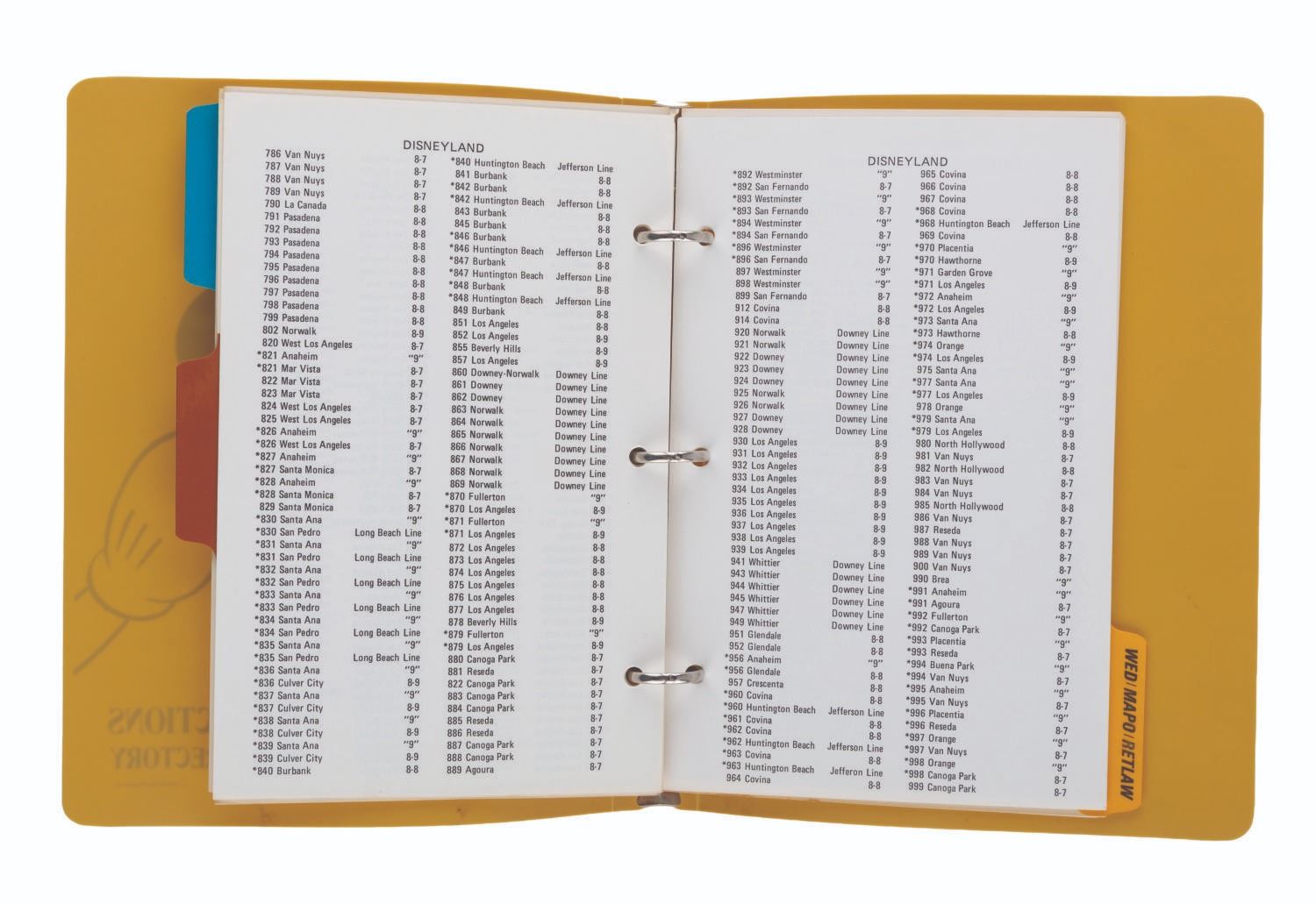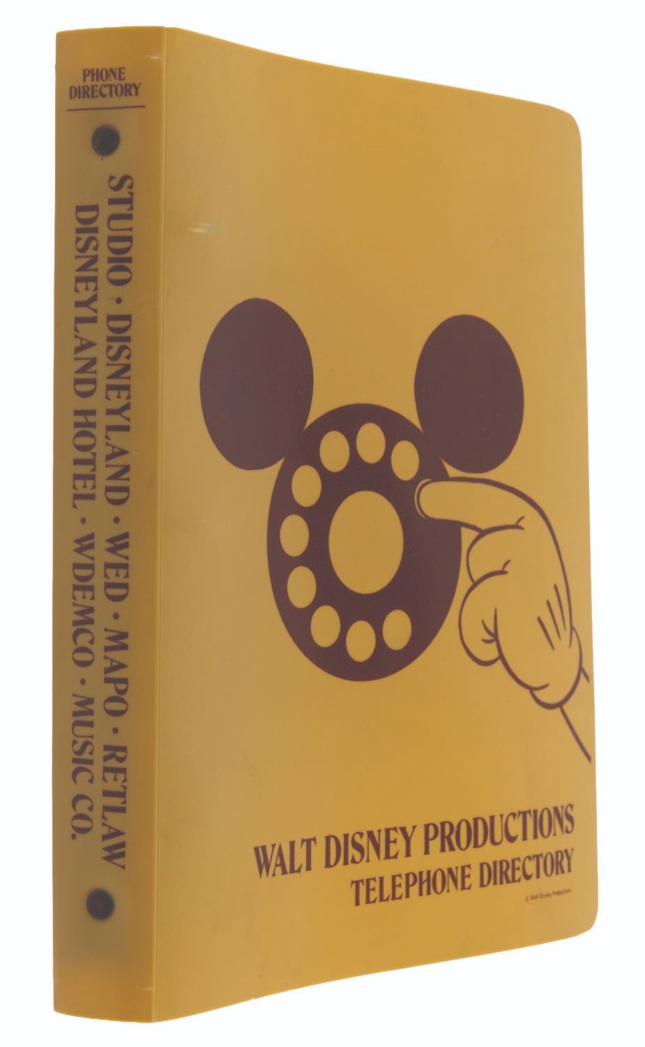 (Disneyland, 1970s) A Walt Disney Productions telephone directory. The three-ring binder includes 71 numbered pages (and many unnumbered) of phone extensions, addresses, and other contact information for the employees of Disneyland, Walt Disney Studios, and WED/MAPO/RETLAW. Notable extensions listed include Disney Legends Wally Boag, Tony Baxter, and Martha Blanding. Measuring 9" x 7" x 1", the directory is in very good condition with light wear from use, including a stress mark in the cover from the metal ring inside.