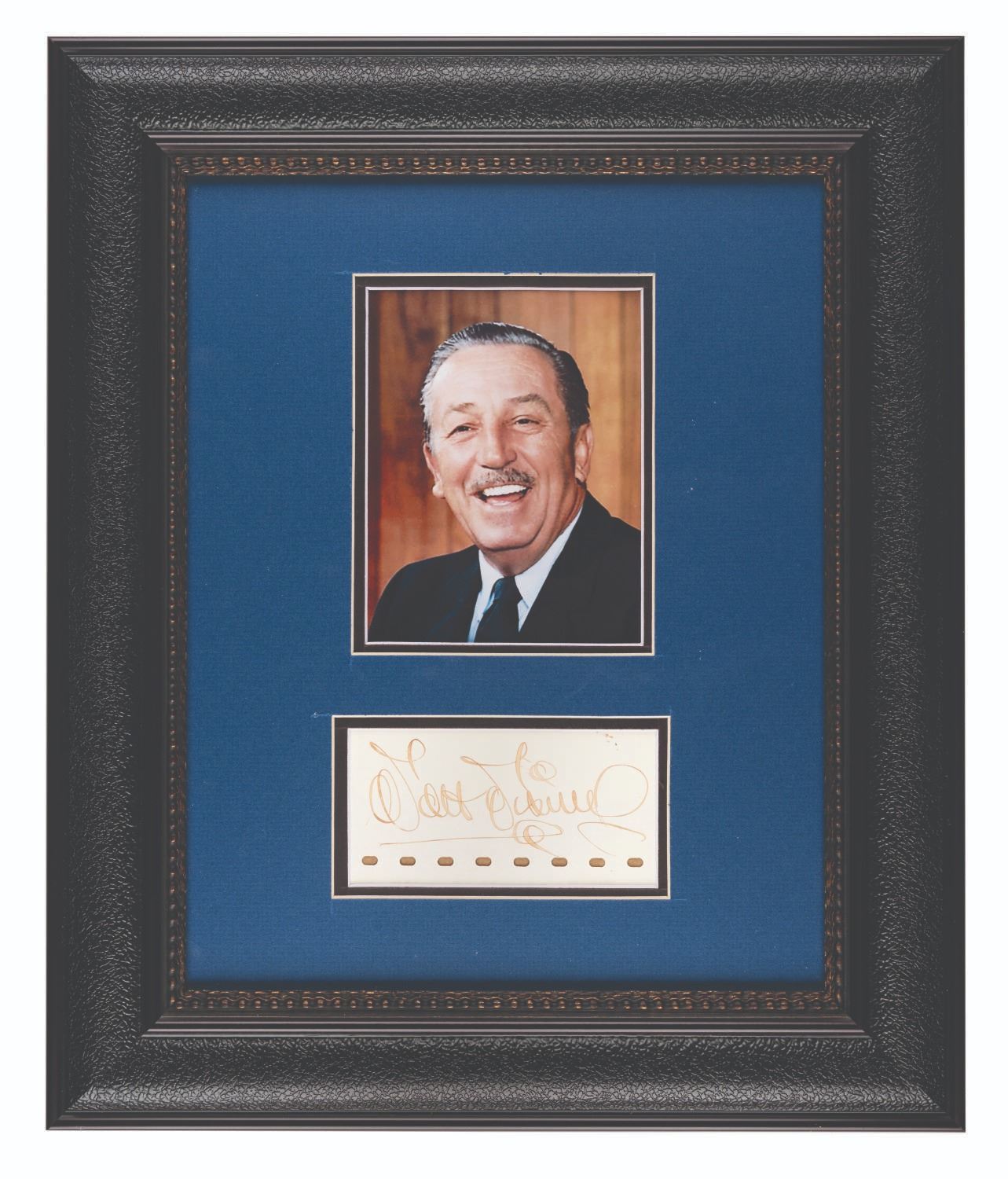 (Disney, 1940s-50s) A very bold signature by Walt Disney, presented with his photograph. Although the photo is his portrait from the 1960s, the signature written with a steel-tipped fountain pen may date much earlier. The signature on perforated paper with 2.5" x 5" visible is in very good to fine condition with slight flecks of ink original to Walt's signing, and fading from age. The 15.25" x 18.25" frame is in fine condition, with spots of wear to the matte.