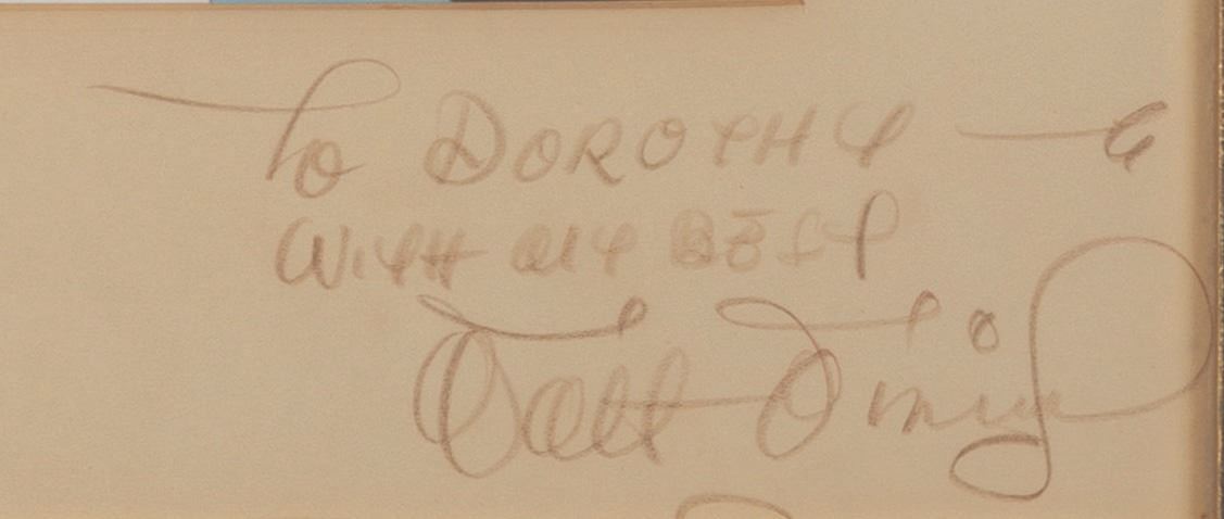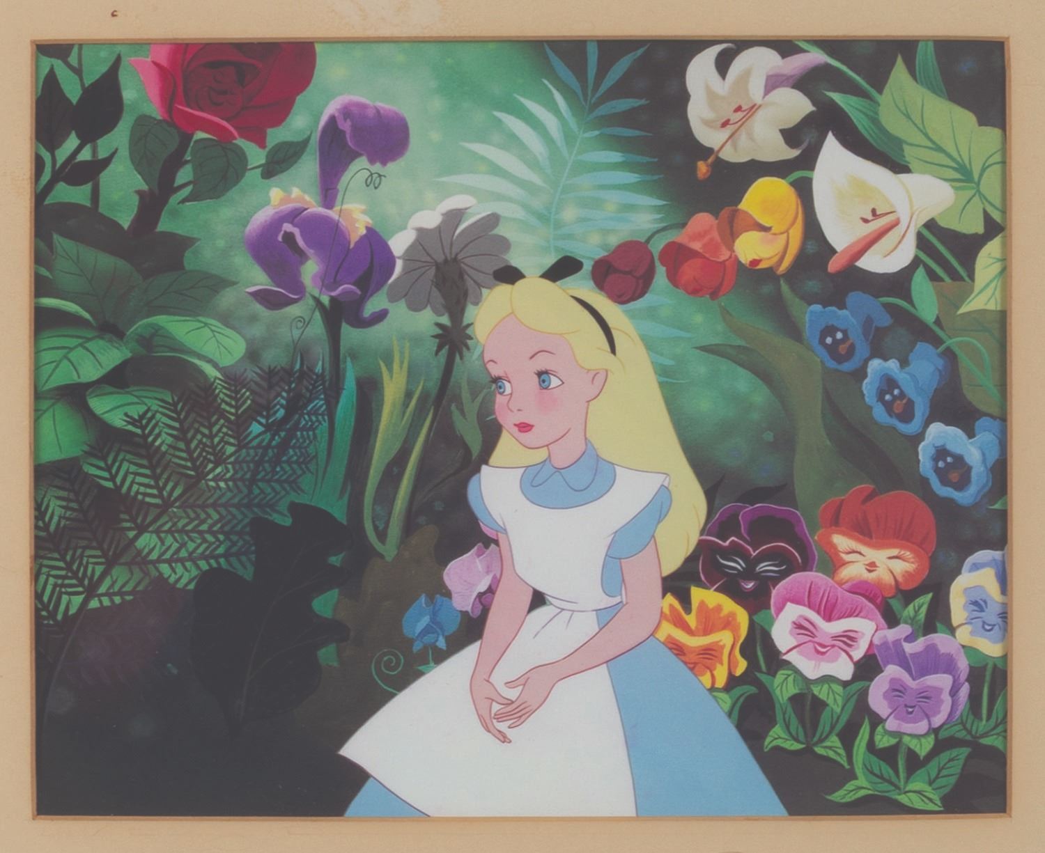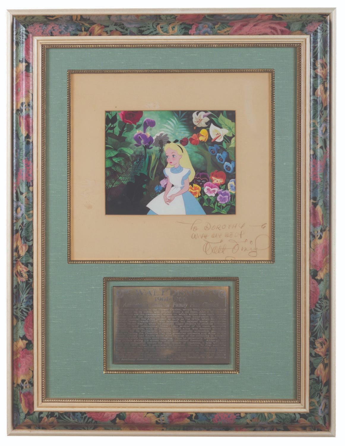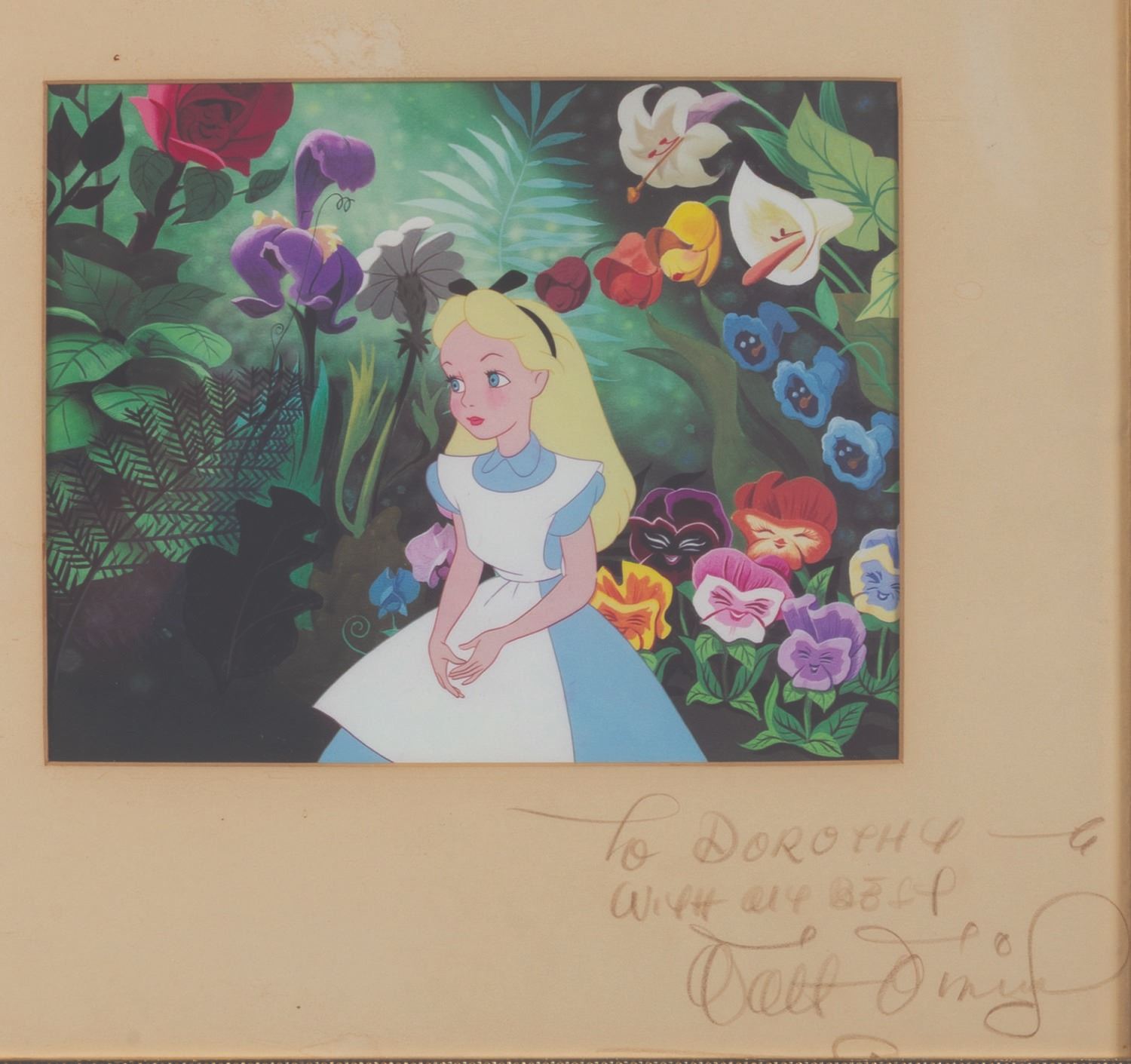 (Disney, 1950s) A Disney Studio photographic dye transfer of a scene from “Alice in Wonderland,” with a matte signed by Walt Disney. Dye transfers such as this were given as gifts to visitors of the Studio and sold through the Art Corner at Disneyland. Walt signed the matte with the dedication “To Dorothy, with my best.” The art comes in a custom frame featuring a Walt biographical plaque and painted flowers along the edges. Measuring 8” x 10” in the 14.5” x 15.5” signed matte, the dye transfer displays in very good condition with light spots of discoloration. The matte is in fair condition with pilling to the fabric, and stains, which do not affect the signature. The 25” x 33.25” custom frame displays in very good condition with light scuffs, and wear.