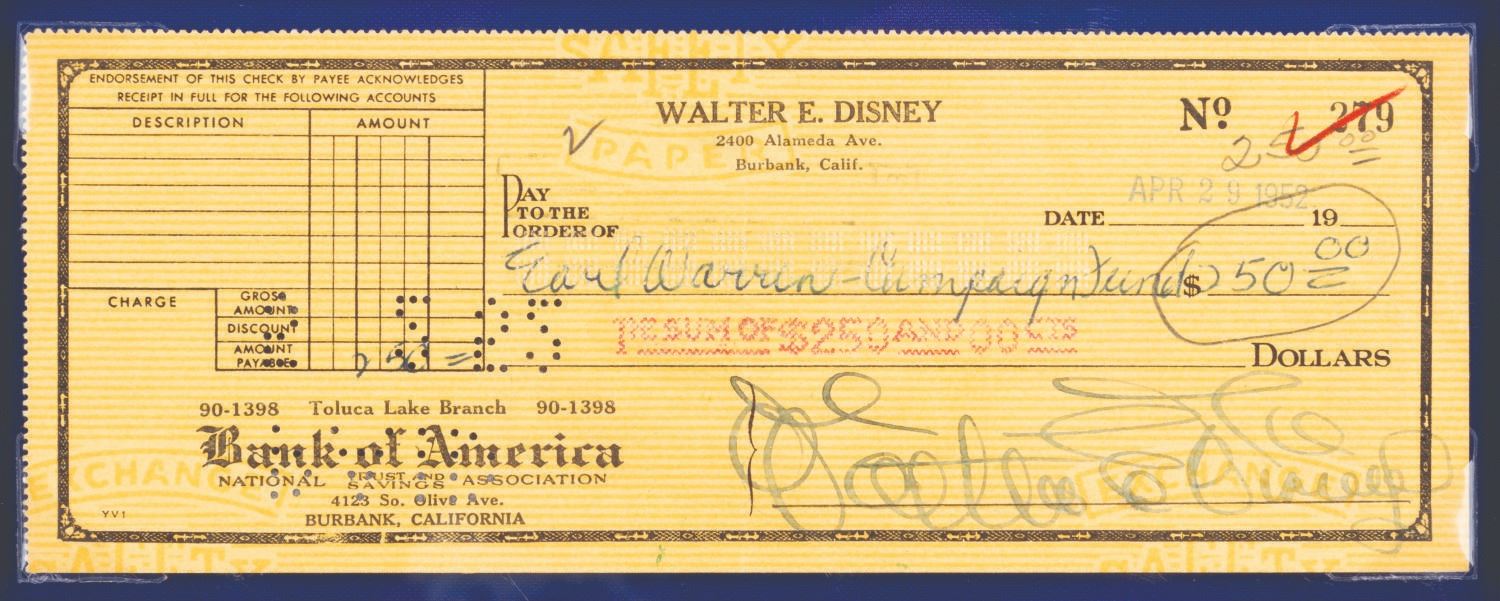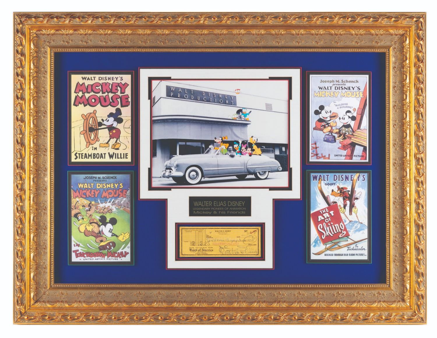 (Disney, 1952) A check signed by Walt Disney himself, drawn from his personal bank account. Stamped April 29, 1952, Walt personally made this check out to the Earl Warren Campaign Fund for 250 dollars, and signed boldly in ink, overflowing the signature area of the check with expressive flourishes. The check is presented in an ornate display with reproductions of Disney cartoon posters, and an image of Walt driving through the Studio entrance with Mickey and friends along for the ride. The check measures 3” x 8” with the signature measuring 1” x 4” and is in very good condition with a central vertical crease and light wear from original handling. The ornate metallic gold-painted molded wood frame measures 31.75” x 41.75” and is in very good condition with light surface wear. Due to size and weight, this item requires special shipping arrangements. Please inquire before bidding.