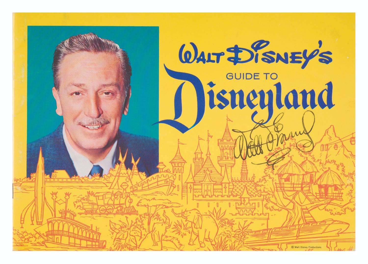 (Disneyland, 1962) A Walt Disney autographed 1962 Guide to Disneyland book. This souvenir book features sections highlighting the attractions, special shows, exhibits and restaurants of all five lands. Walt would often visit the park and sign autographs for visitors. This guidebook has been boldly signed "Walt Disney" on the front cover. Measuring 11.5"x8" the 27-page souvenir guidebook, is in very good used condition, with few creases and minor wear from handling and age. The signature remains bold.