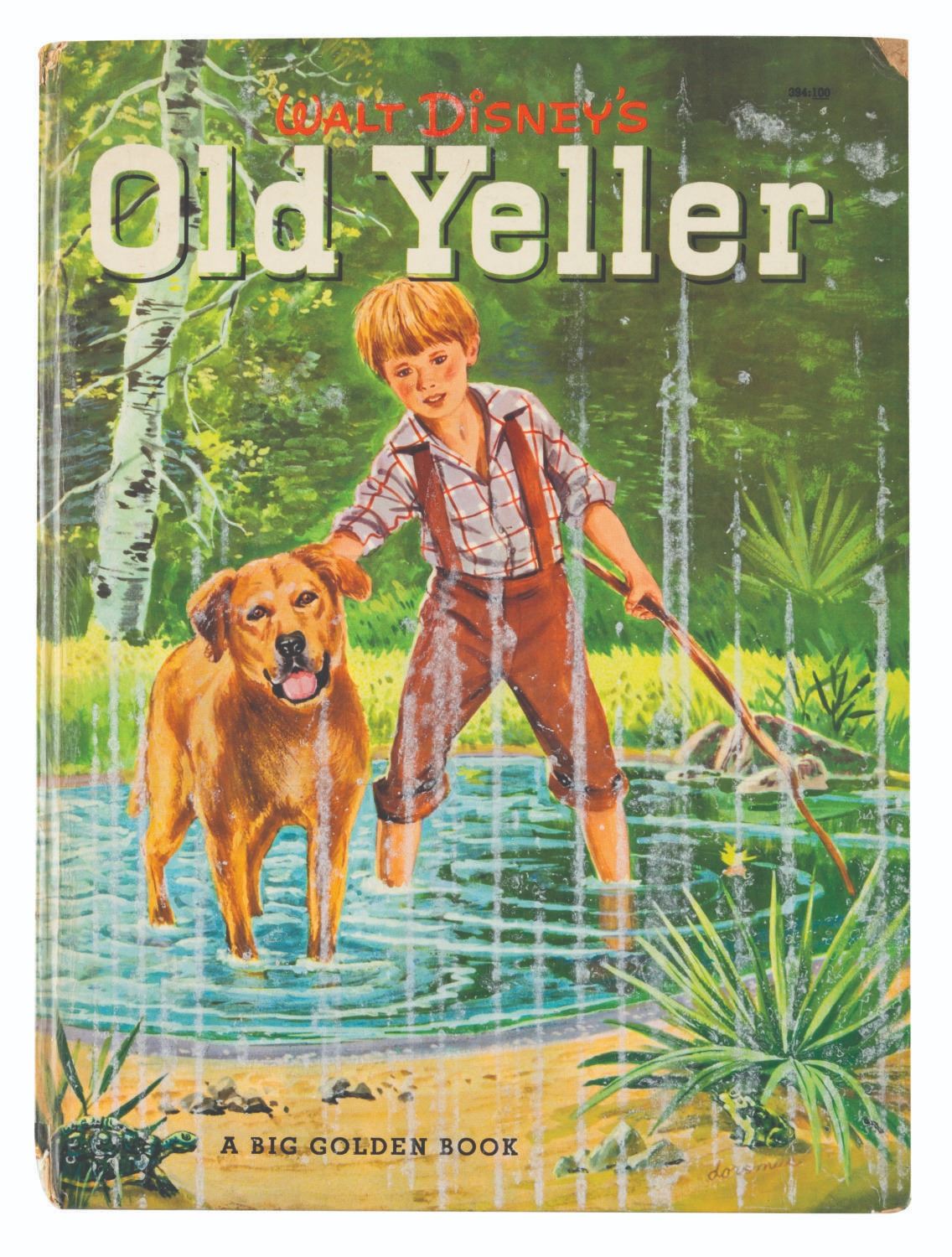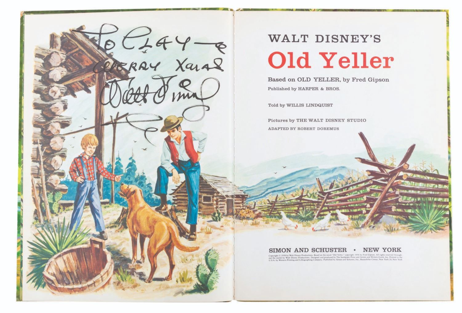 (Simon and Schuster, 1958) An “Old Yeller” Big Golden Book, signed on the title page by Walt Disney. The bold black marker inscription reads “To Clay - Merry Christmas, Walt Disney.” Measuring 9.5” x 12.75”, the book is in good condition with light wear, edge tears, and discoloration from age, while the book cover exhibits heavy stains, streaks, and material loss at the corners.