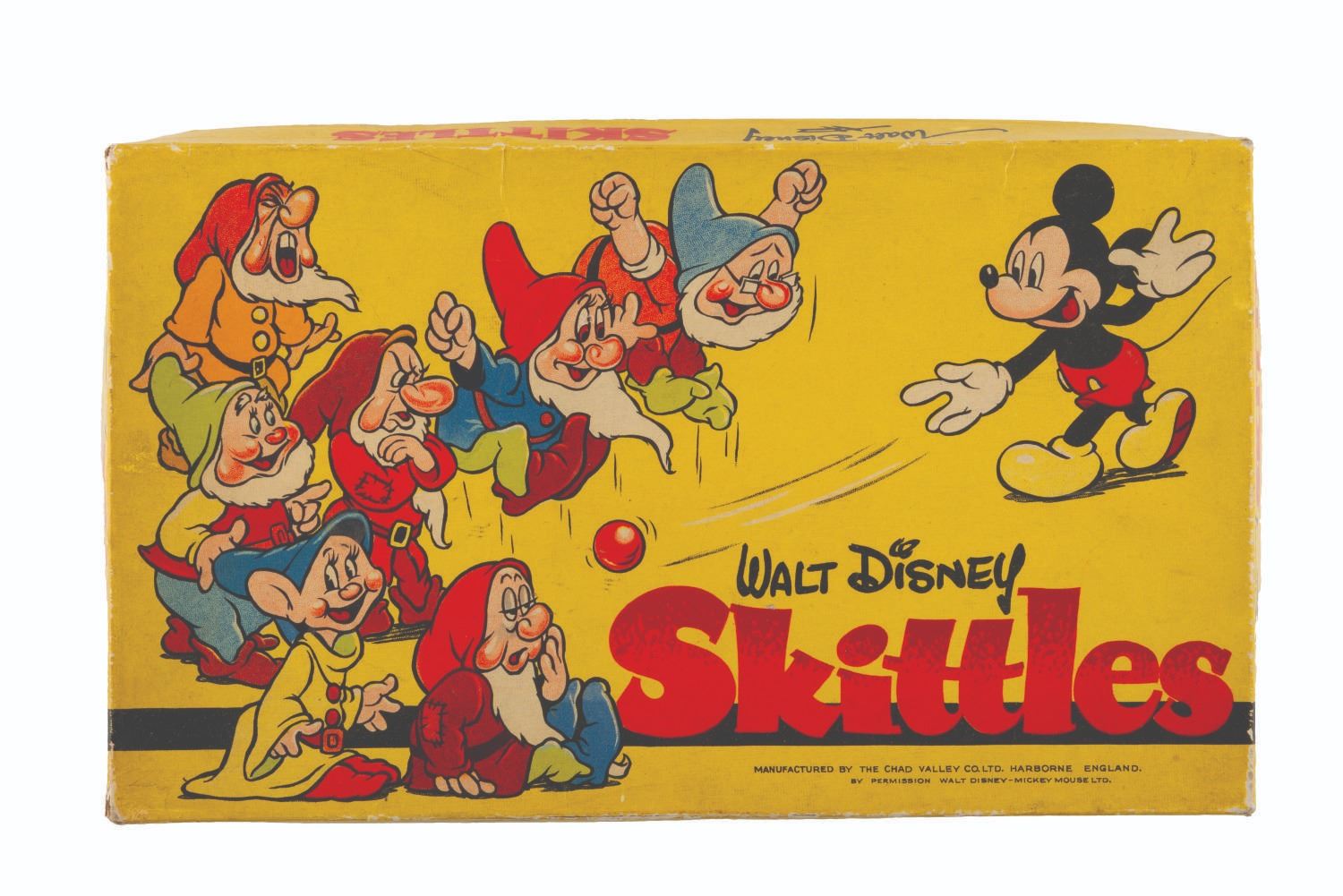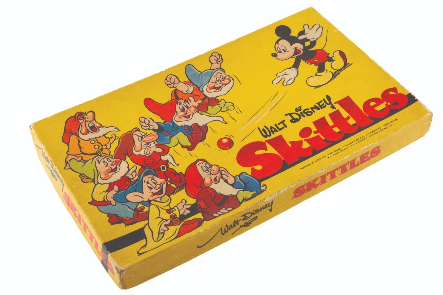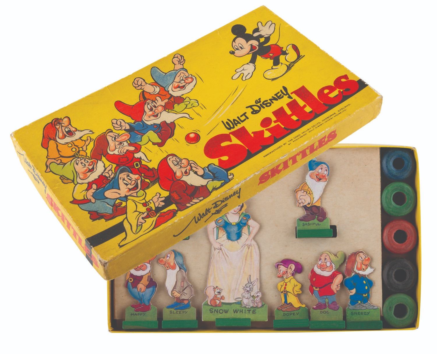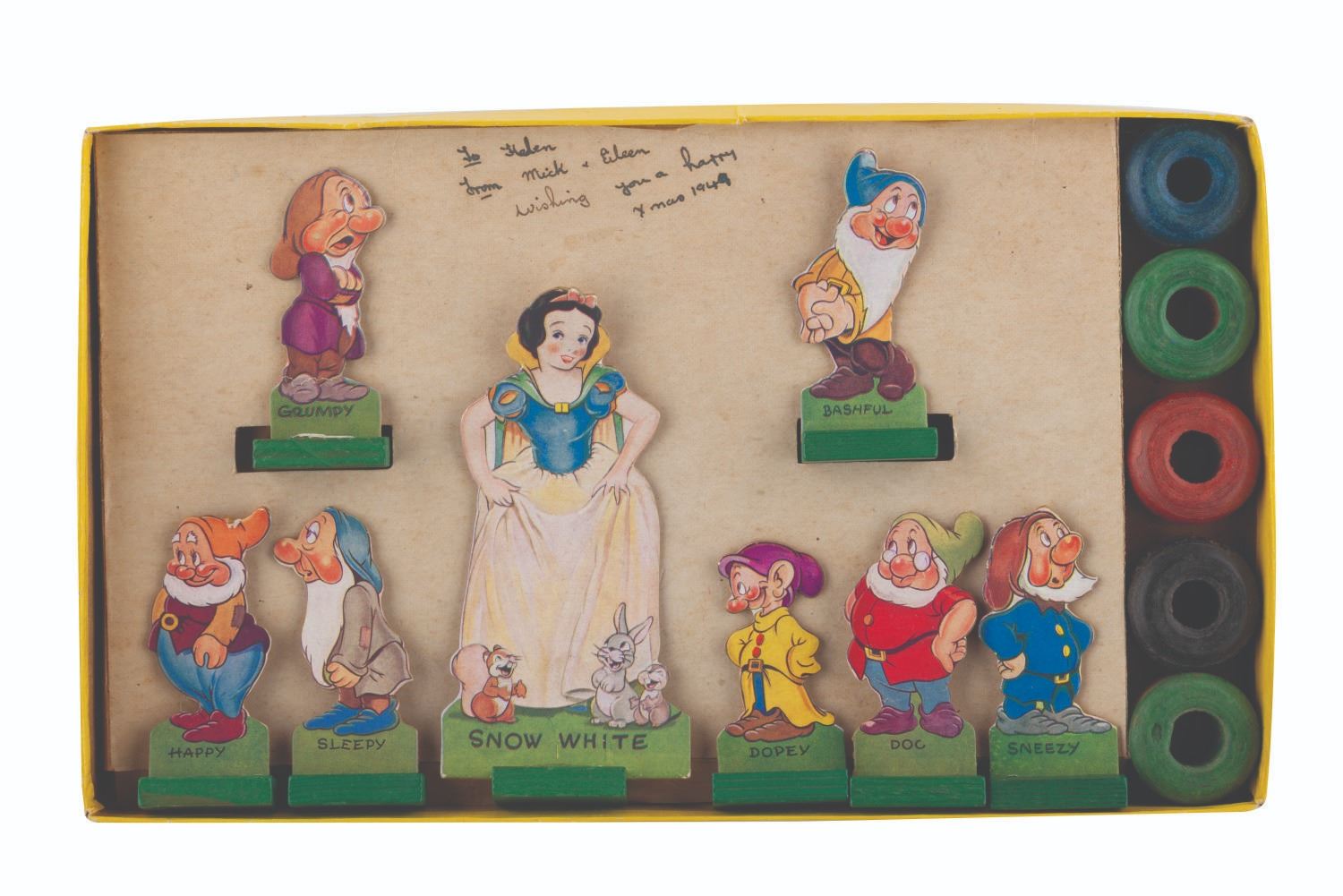 (Chad Valley, 1930s-1940s) A Walt Disney Skittles game manufactured by the Chad Valley of England. The game features five tokens and eight “Snow White and the Seven Dwarfs" game pieces. Measuring 7.25" x 12.25", the game is in good condition with light creases, discoloration from age, and wear from use.
