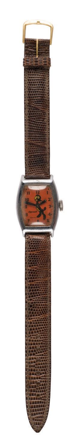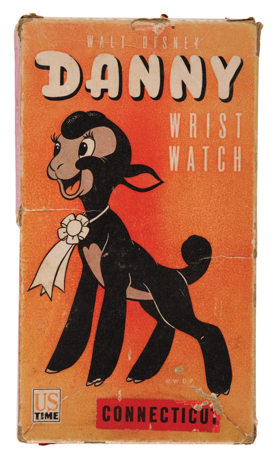 (U.S. Time, 1949) A wristwatch of Danny from "So Dear to My Heart" with original box. This charming watch uses Danny's front legs as minute and hour hands. Measuring 1.25"x10", the watch displays in very good condition, with light wear to the case from display, but non-functioning and in need of service. The 7"x4" box is in fair condition, with wear, two split corners, and insert missing
