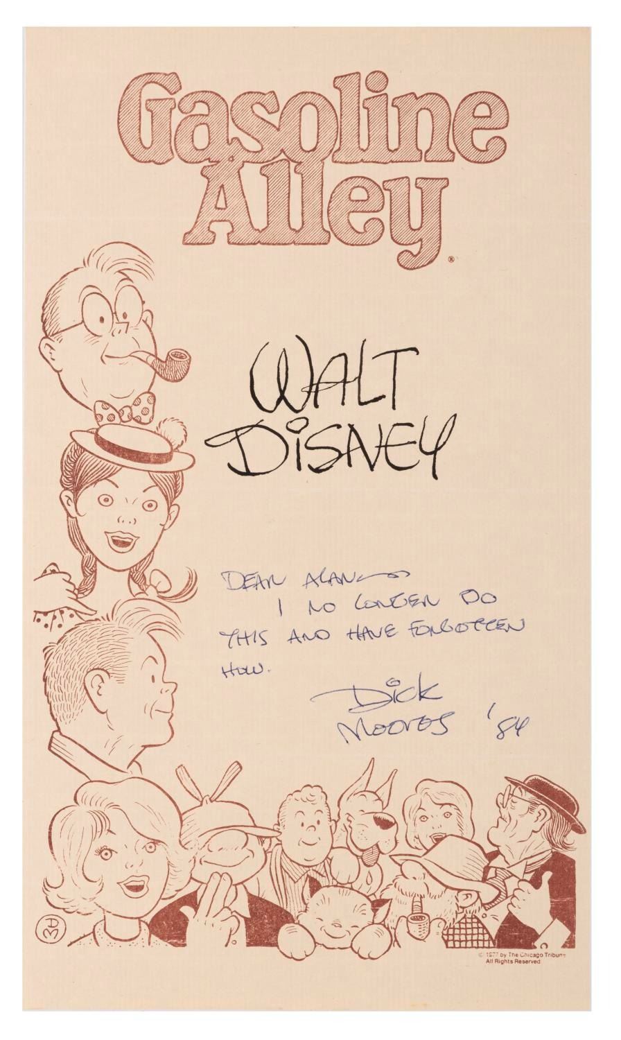 (Moores, 1984) A signed dedication and spoof Walt Disney signature from Gasoline Alley artist Dick Moores. Accomplished in marker and blue pen on 6.5” x 11” Gasoline Alley-themed paper, the piece is in fine condition with folds from mailing.