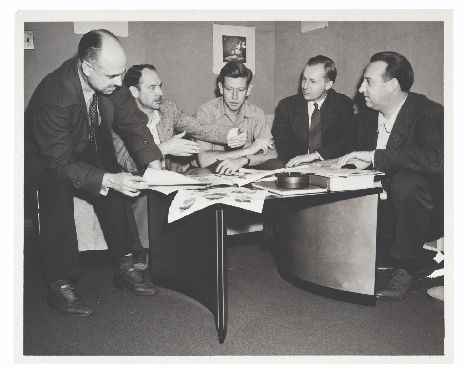 (Disney, 1940) An early Walt Disney Studio publicity photo taken in October 1940, featuring Ben Sharpsteen, Wilfred Jackson, and their fellow "Fantasia” creatives analyzing character art in a meeting. This print was likely made in the 1970s or 1980s and has a Walt Disney Productions stamp on the reverse. Measuring 8” x 10”, the print is in good condition with scratches, edge wear, and a 0.75" torn-off piece that has been reattached out of place.
