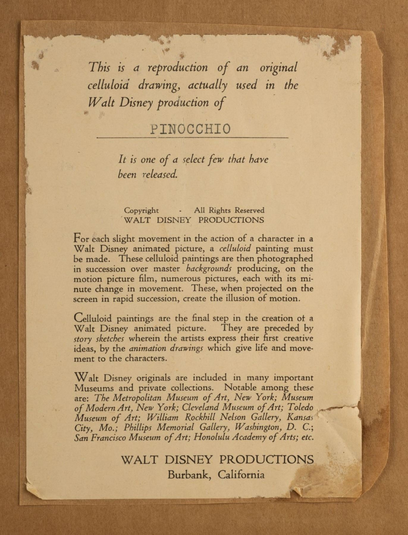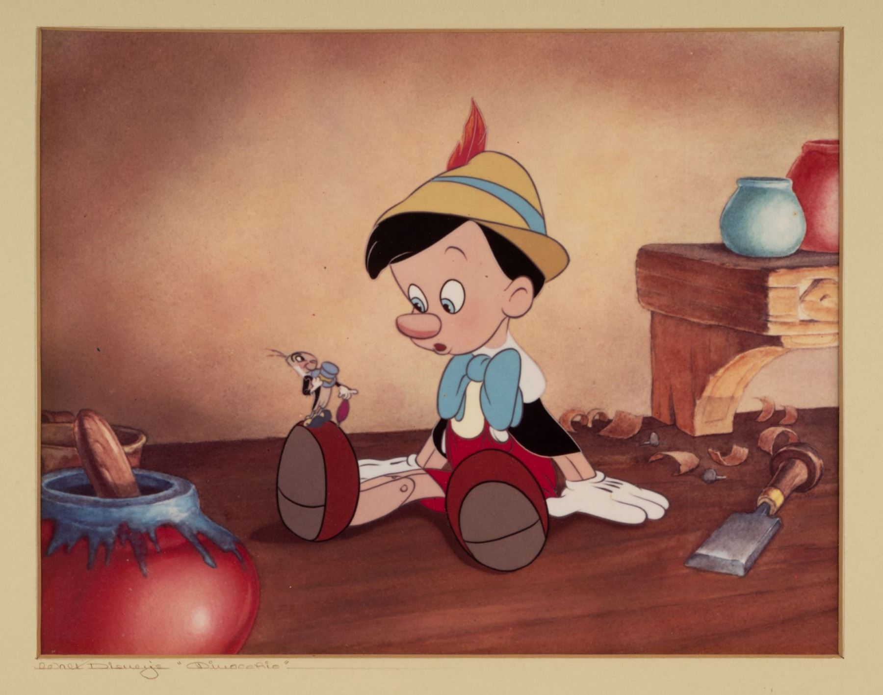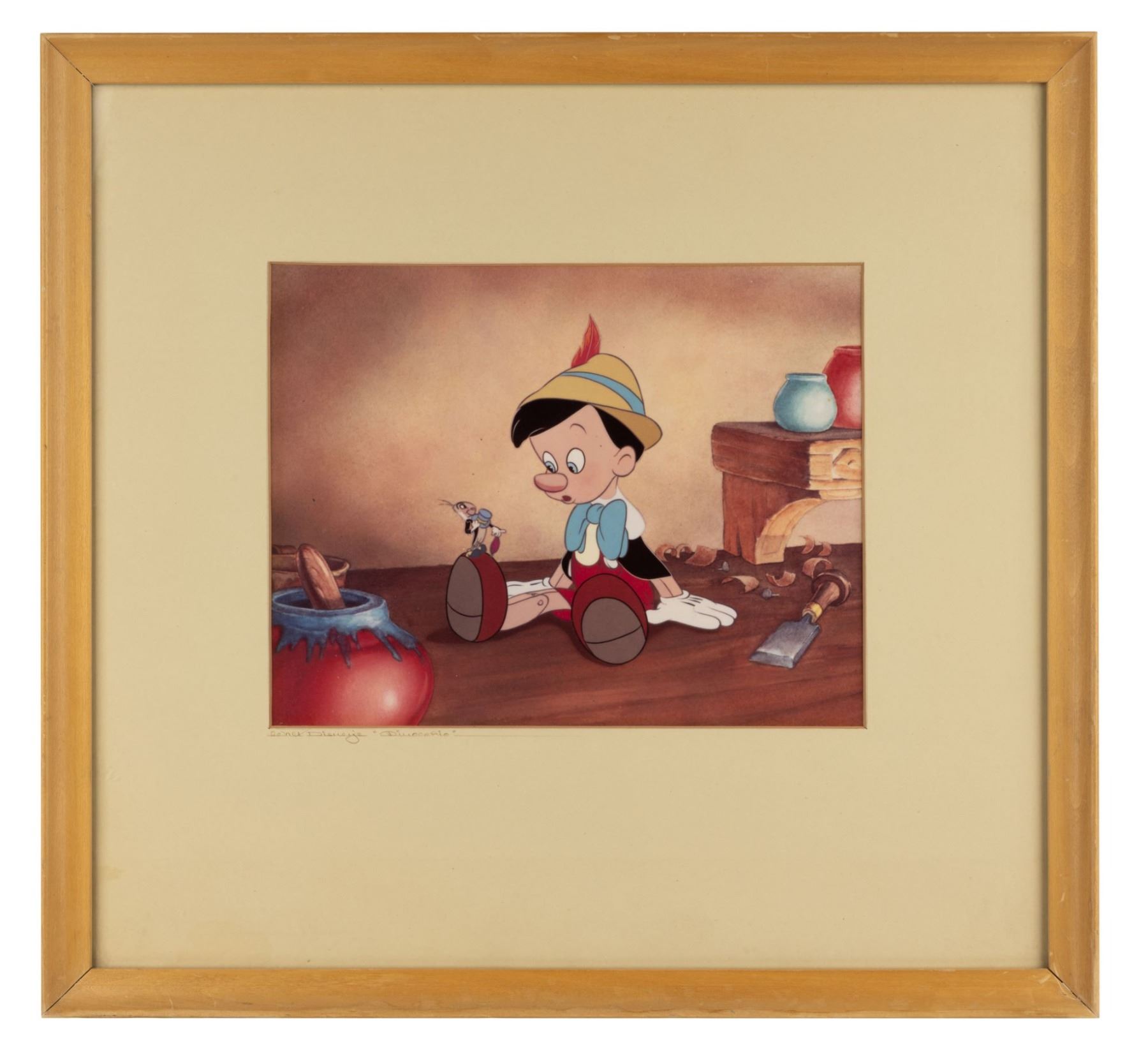 (Disney, 1950s-80s) A Disney Studio photographic dye transfer of a scene from “Pinocchio.” Dye transfers such as these were given as gifts to visitors of the Studio and sold through the Art Corner at Disneyland. With 7.25" x 9.25" visible in the Studio matte and 15.75" x 16.75" frame, the piece displays in good condition with slight fading, and edge wear and scratches to the frame.