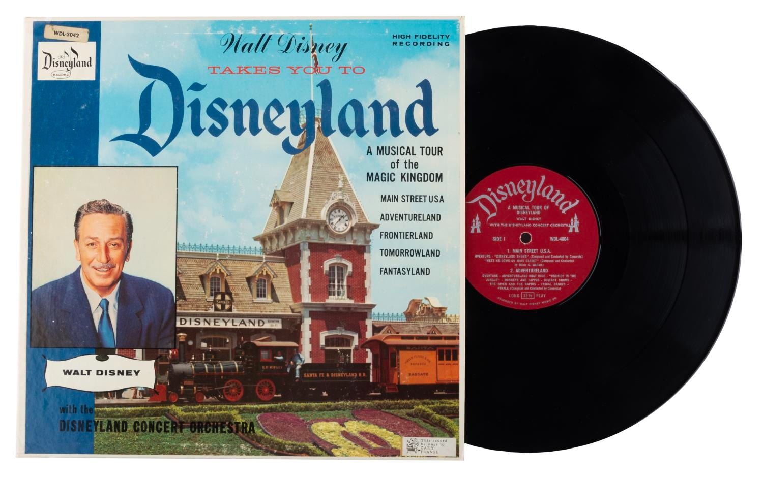 (Disneyland, 1956) A Walt Disney Takes You to Disneyland high-fidelity record. The record provides a musical tour of the Magic Kingdom’s original five lands, with songs performed by the Disneyland Concert Orchestra and narration by Walt Disney. Measuring 12” x 12”, the record appears in fine condition, with the sleeve in good condition with light scuffs overall, and a 4” split in the bottom edge.