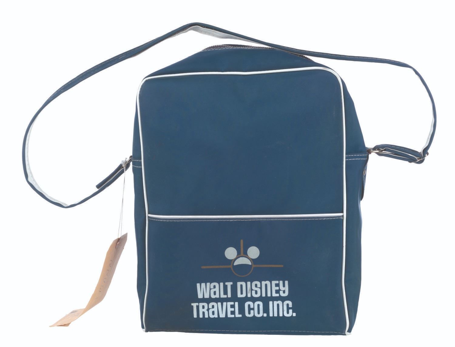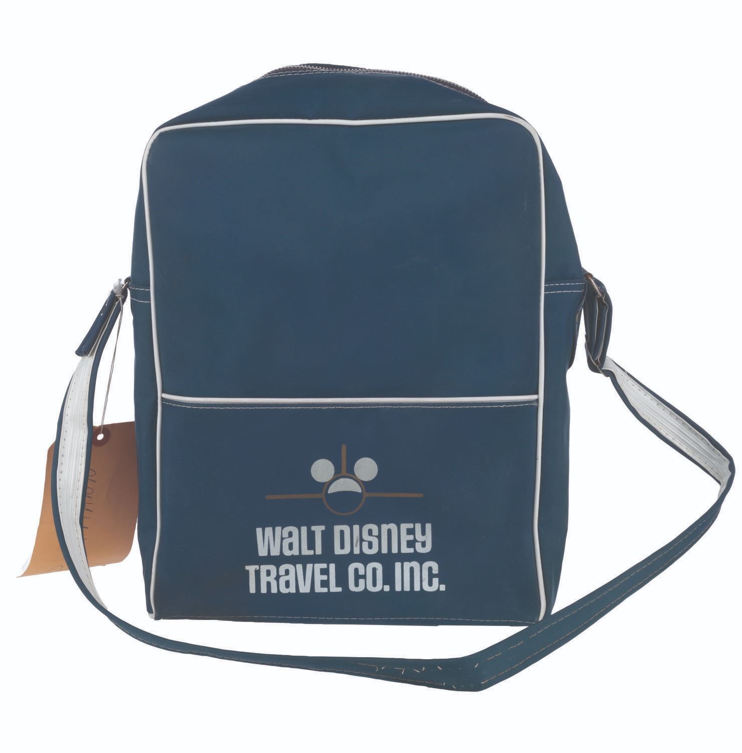 (Disney, 1970s) A Walt Disney Travel Co. Magic Kingdom Club bag, featuring a silkscreen of the Club’s logo on the front, and the Travel Co. logo over the pocket on the back. The nylon bag measures 10.5" x 5" x 13.5" and is in good condition with soiling and a 3" area of ripped stitching on the carrying strap