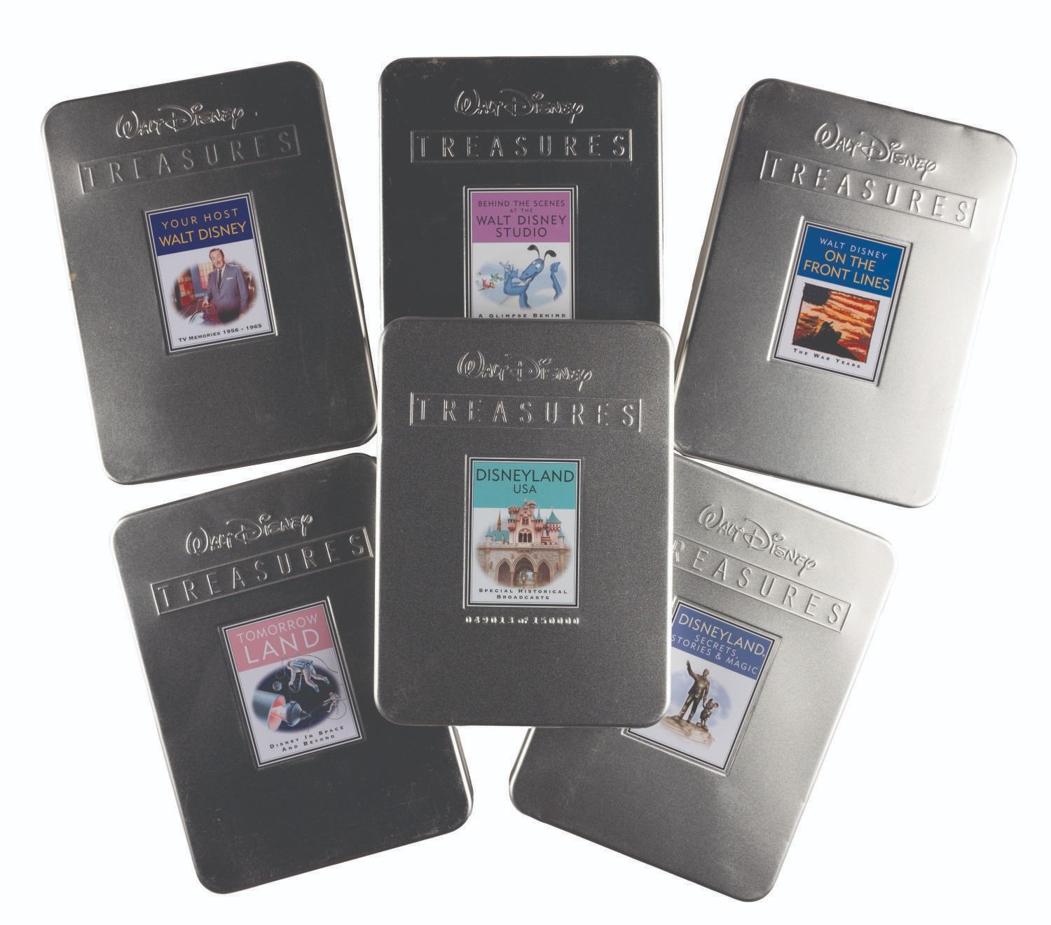 (Disney, 2000s) A collection of six Walt Disney Treasures DVD sets including “Your Host Walt Disney,” “Behind The Scenes at the Walt Disney Studio,” Walt Disney on the Front Lines,” “Tomorrowland,” “Disneyland Secrets, Stories & Magic,” and “Disneyland USA.” All discs are in fine condition with the exception of disc 1 of “Tomorrowland” and disc 1 of "Your Host Walt Disney” which both have light smudges. Measuring 6” x 1” x 8” tall, the cases are all in very good condition with light shelf wear and include all of the original inserts.