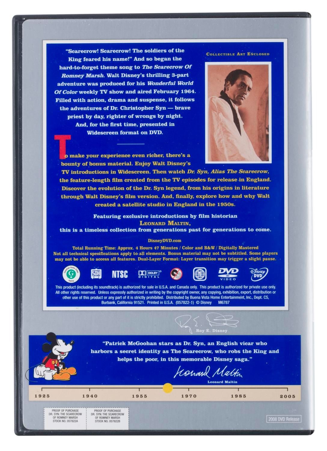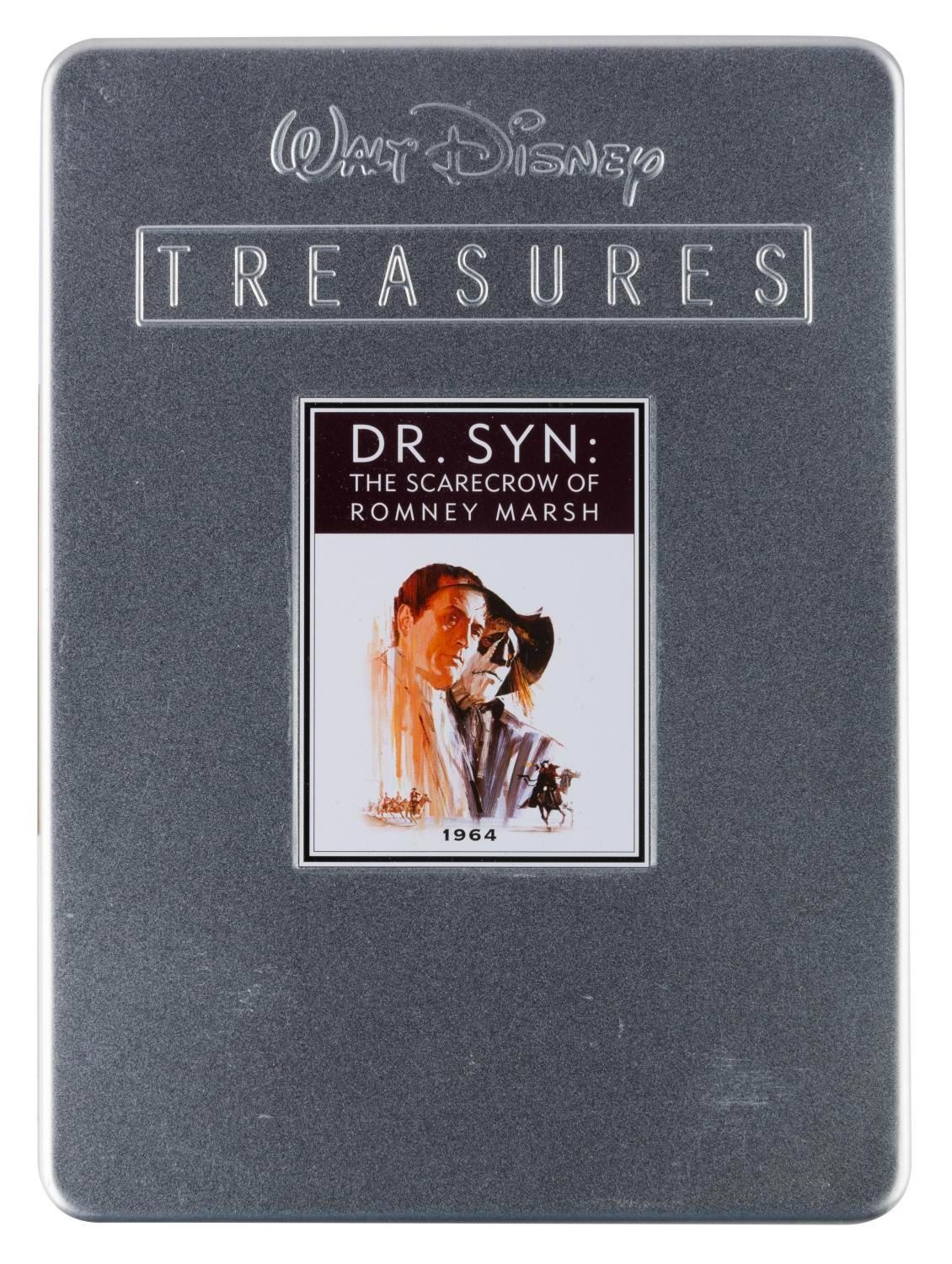 (Disney, 2008) A two-DVD Walt Disney Treasures set of the 1964 Wonderful World of Color 3-part series "The Scarecrow of Romney Marsh.” The set includes a booklet, a reproduction of a publicity photo, and two DVDs that include the foreign theatrical version of the story "Dr. Syn, Alias the Scarecrow.” The DVD set is in very good condition with the original tin and case, with slight wear from handling and use, including one loose disc spindle.