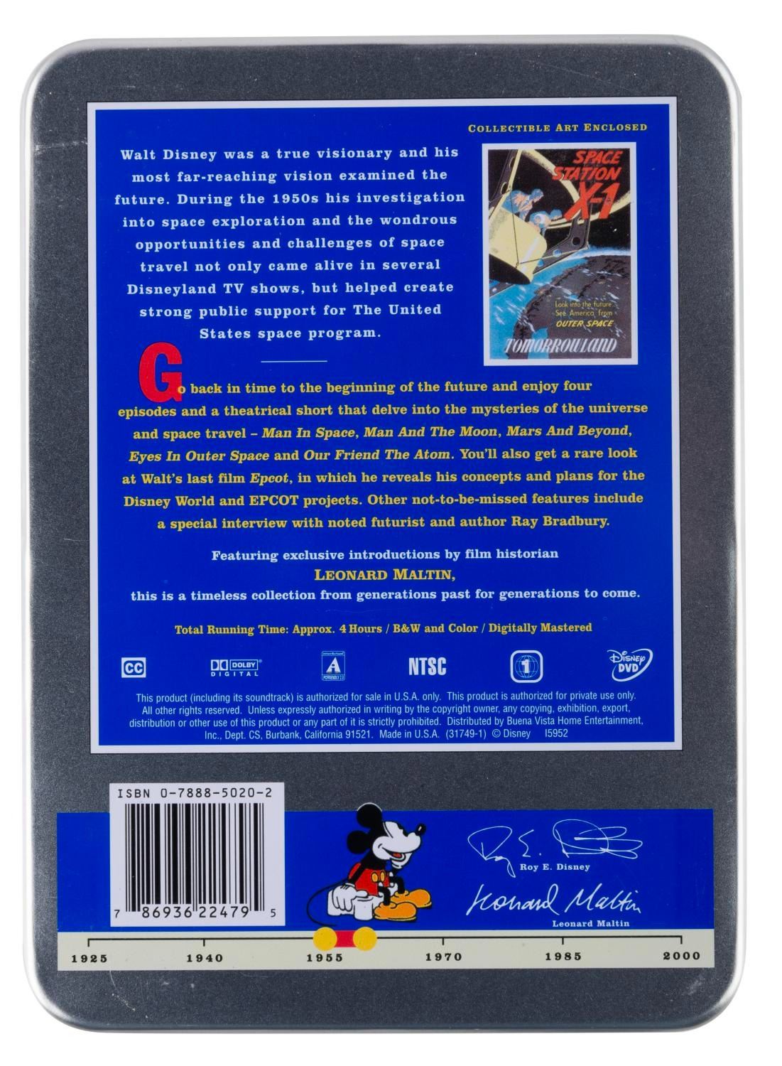 (Disney, 2004) A two-DVD set of Walt Disney Treasures "Tomorrowland: Disney in Space and Beyond.” The set includes Disney’s groundbreaking series on the possibilities of space travel from the Disneyland TV show: Man in Space, Man and the Moon, and Mars and Beyond. The set is in very good condition with a faint scratch to one DVD.