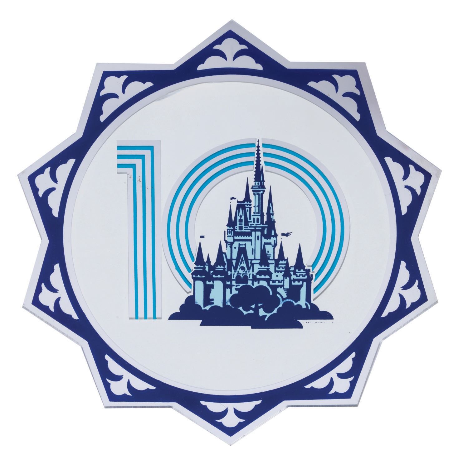 (Walt Disney World, 1981) A Walt Disney World "10 Years" Lamppost Sign. The reflective sign depicts the iconic Cinderella Castle and was displayed in celebration of the milestone anniversary. Measuring 10" in diameter, the acrylic sign is in very good condition with scuffs and wear from display, handling, and age.