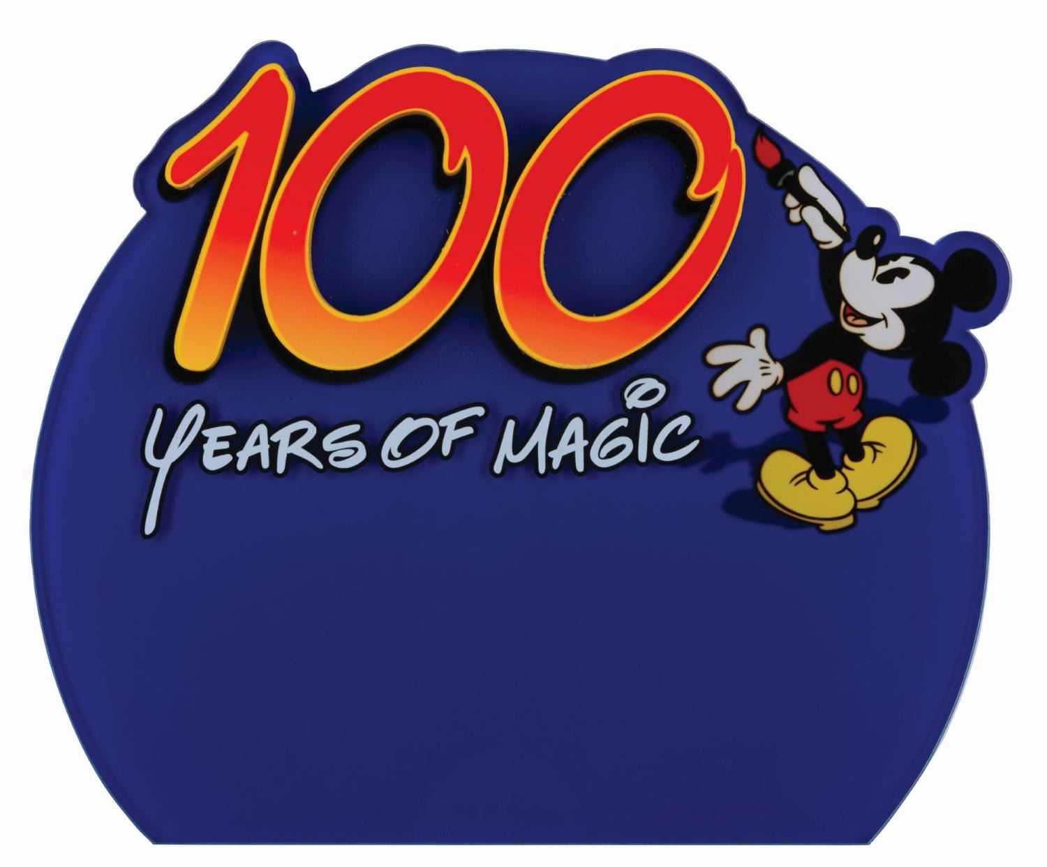 (Walt Disney World, 2001-2003) A sign displayed for the"100 Years of Magic" celebration at Walt Disney World in honor of Walt Disney's 100th birthday. The acrylic sign features Mickey painting a 3D "100" and has space at the bottom for additional information or text. Measuring 10" x 12", the sign is in very good condition with light scuffs and scratches.