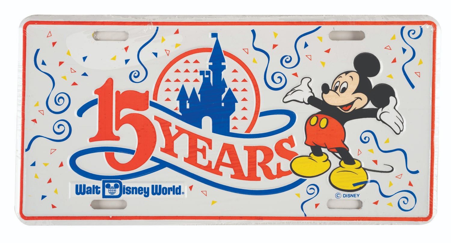 (Walt Disney World, 1986) A novelty souvenir license plate for the 15th anniversary of Walt Disney World. Measuring 12" x 6", the metal plate is in fine condition, sealed in its original plastic shrink wrap.
