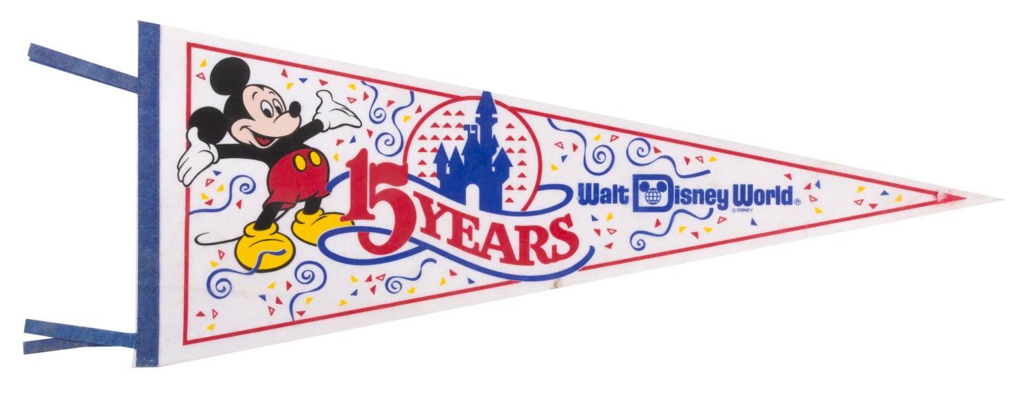 (Walt Disney World, 1986) A souvenir pennant featuring Mickey Mouse from the 15th anniversary of Walt Disney World. Measuring 35” x 12”, the pennant is in good condition with stains, creases, pinholes from display, a 0.25” tear, and discoloration from age.