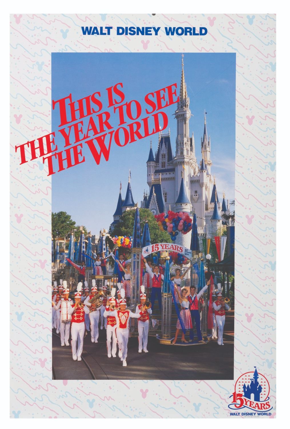 (Walt Disney World, 1986) A poster for Walt Disney World's 15th anniversary featuring a celebration in front of Cinderella Castle. Measuring 20" x 30", the poster is in good condition with light wear throughout, a 0.25" tear in the left edge, and two 0.5" and 0.75" holes to the lower right corner.