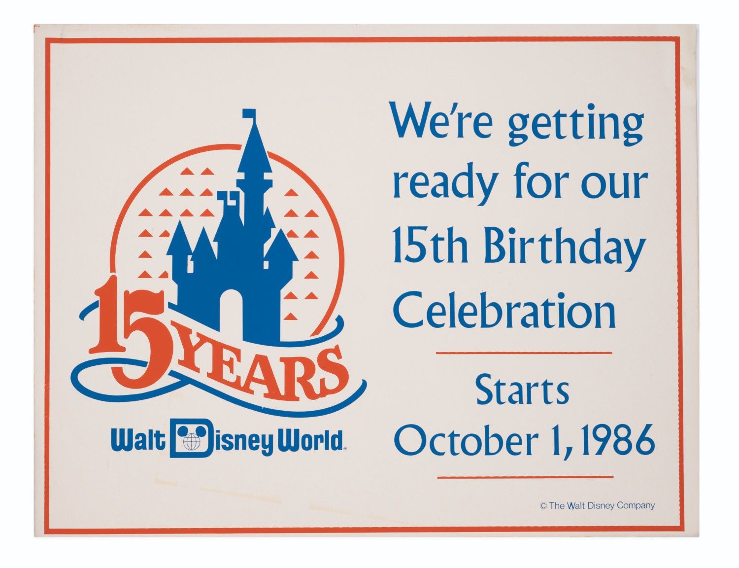 (Walt Disney World, 1986) A sign announcing Walt Disney World’s upcoming 15th anniversary celebration. Measuring 11” x 14”, the paper sign is in good condition with light discoloration from age, edge wear, creases, and stains from Park use.
