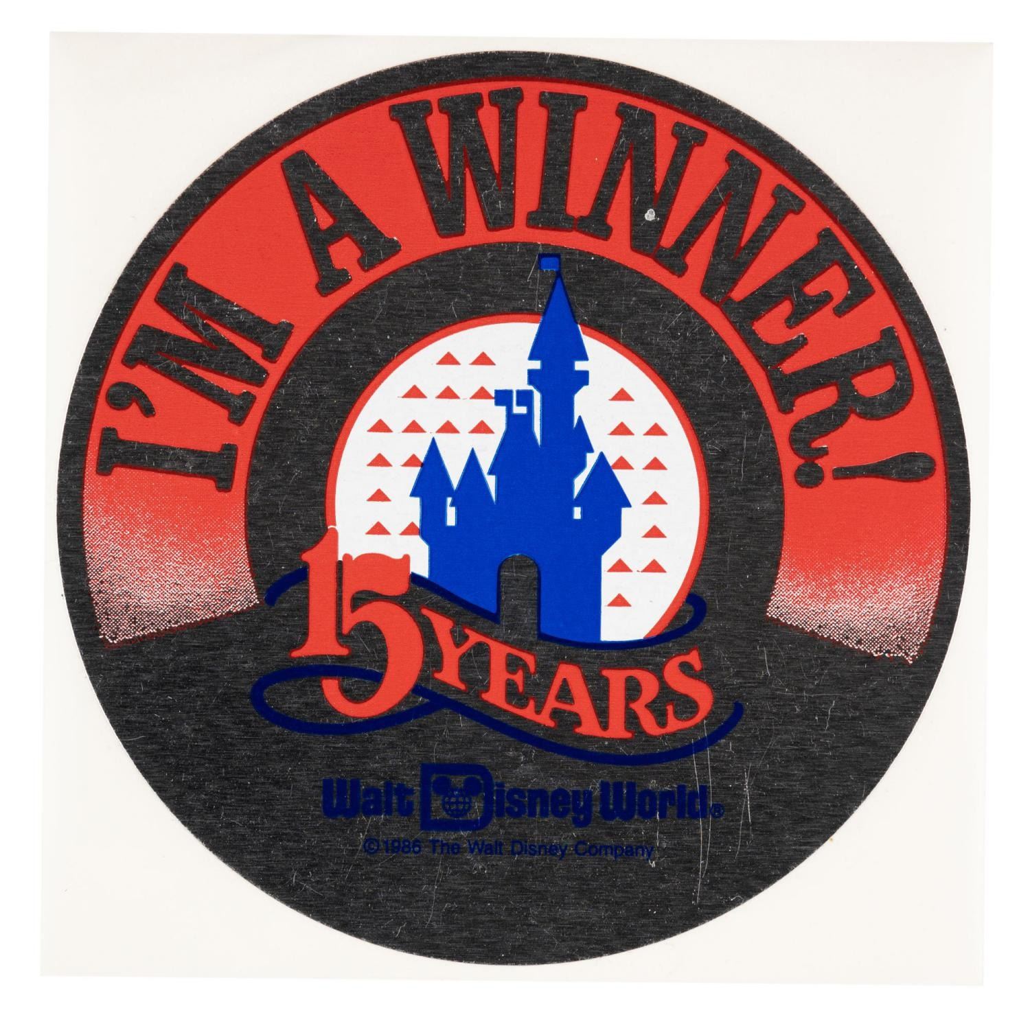 (Walt Disney World, 1986) A Walt Disney World 15th anniversary “I’m a Winner!” sticker. Measuring 4” in diameter on 4.25” x 4.25” backing, the shiny sticker is in very good condition with surface scratches.