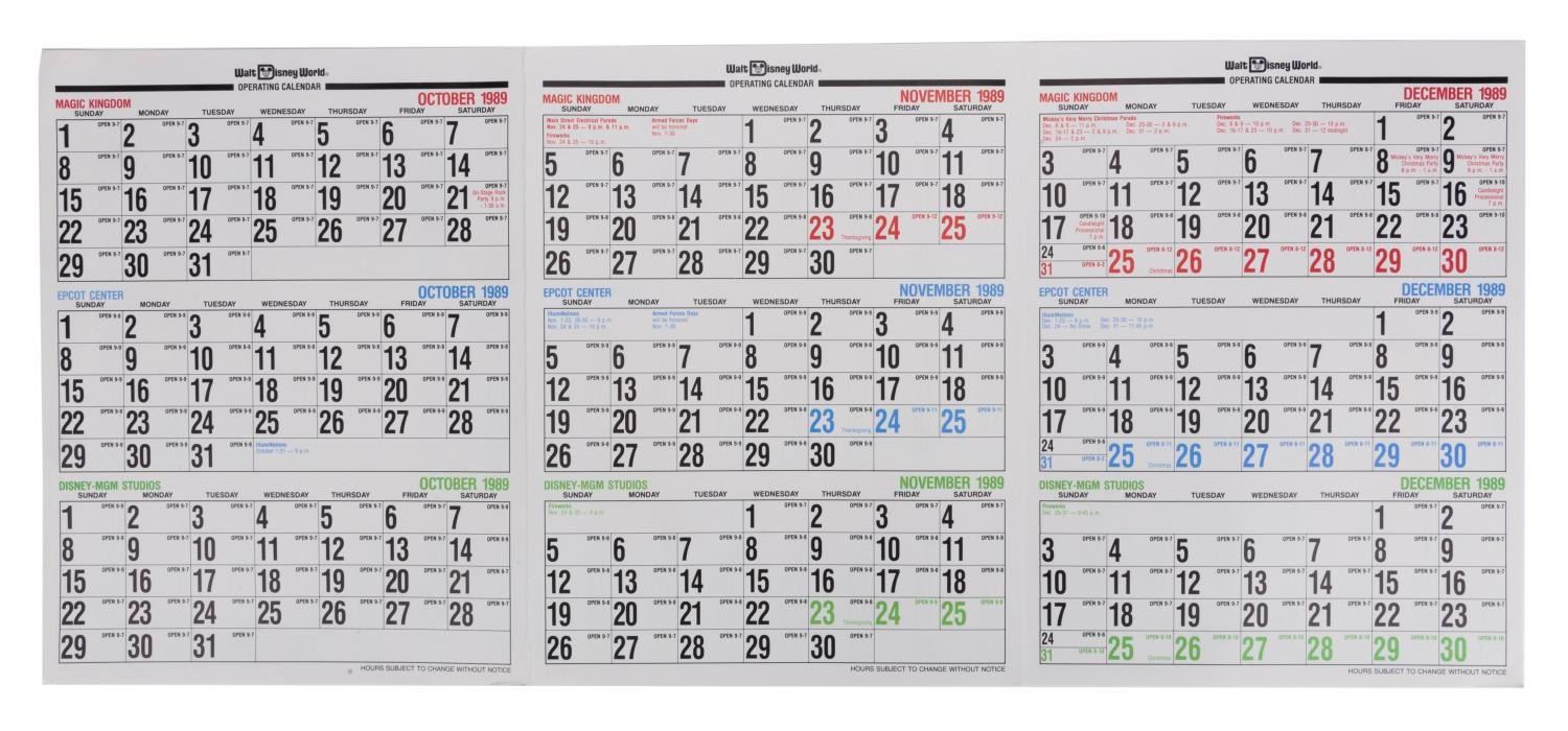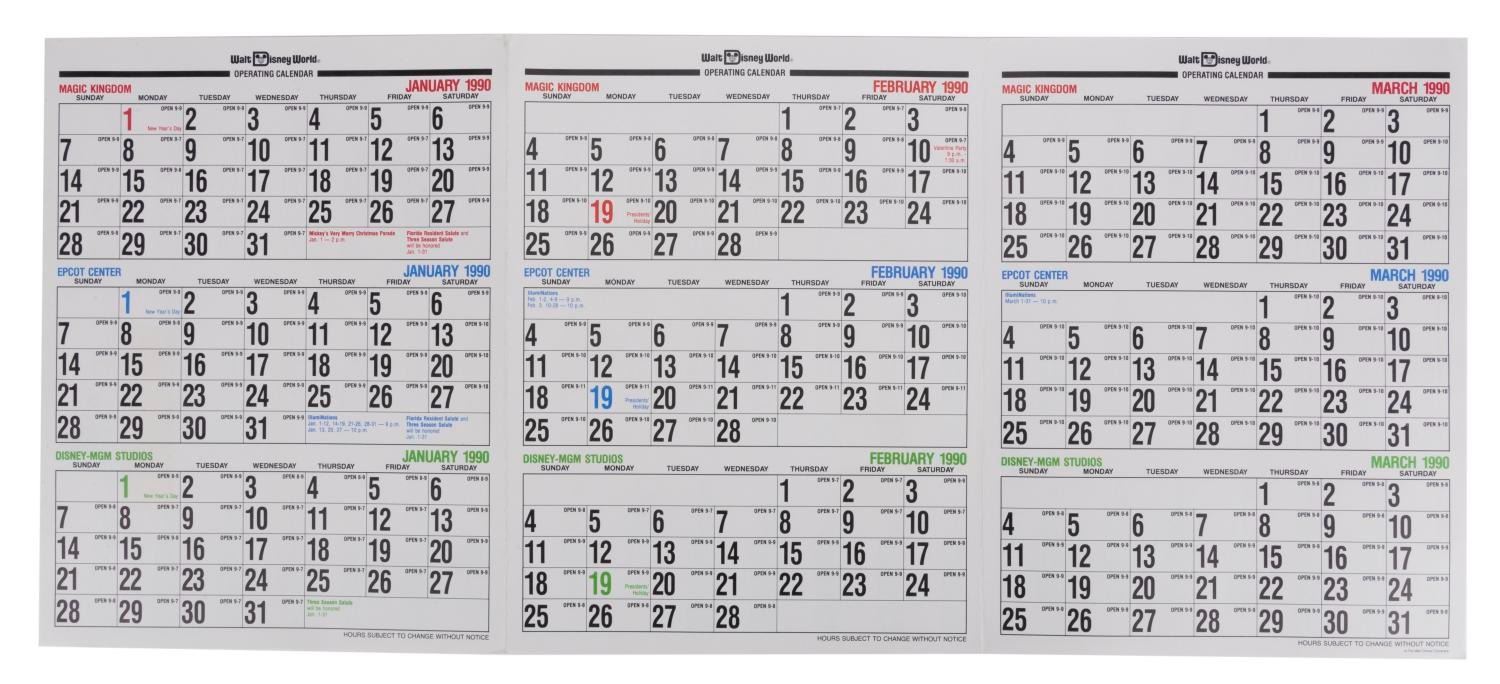 (Walt Disney World, 1990) A Walt Disney World Operating Calendar. This trifold calendar divulges the dates of special events, showtimes, and operational hours of The Magic Kingdom, EPCOT Center, and Disney-MGM Studios Parks. Measuring 11”x8.5” when folded, this piece is in very good condition with a few faint areas of wear to its edges.