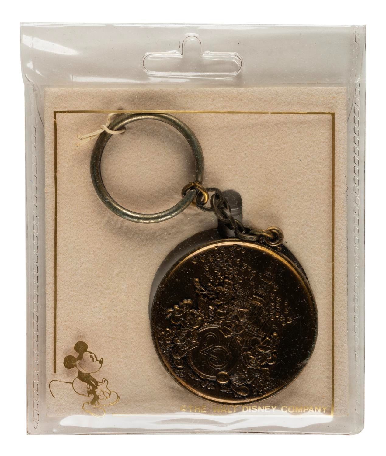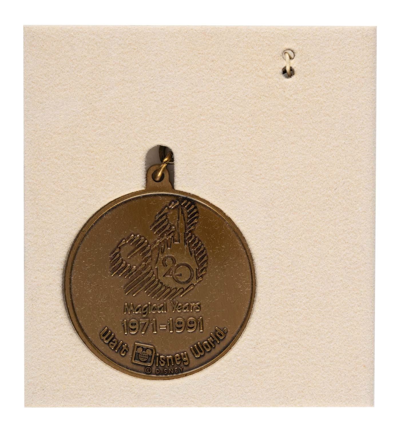 (Walt Disney World, 1991) A souvenir medallion keyring commemorating "20 Magical Years" of Walt Disney World. Measuring 1.75" in diameter, the souvenir is in very good with light wear to its 3.5" x 4" package.