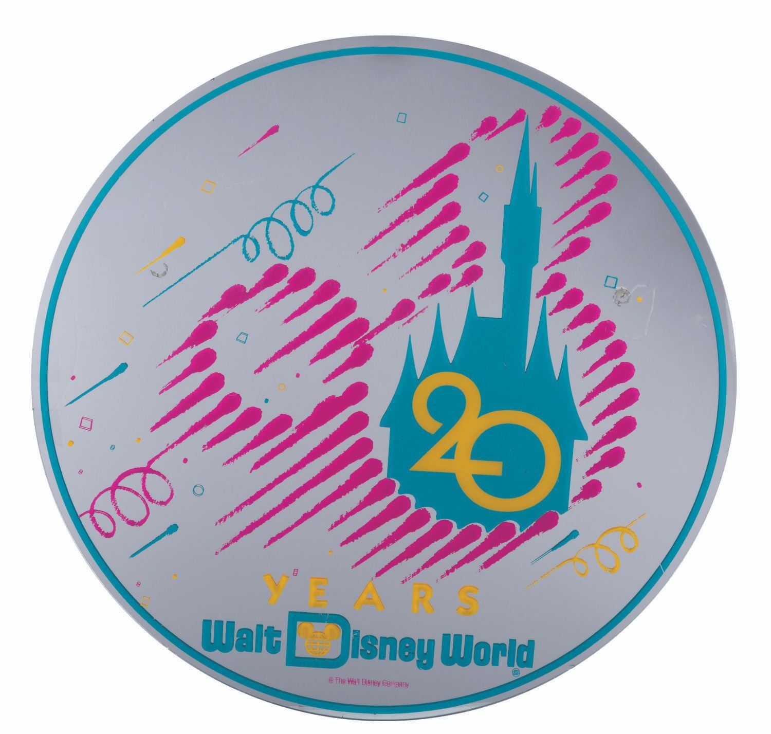 (Walt Disney World, 1991) A mirrored lamppost sign with the logo for Walt Disney World’s 20th anniversary. Measuring 20" in diameter, the acrylic sign displays in good Park-used condition with typical scratches, scuffs, and two 0.5" diameter gouges from the mounting hardware on the reverse.
