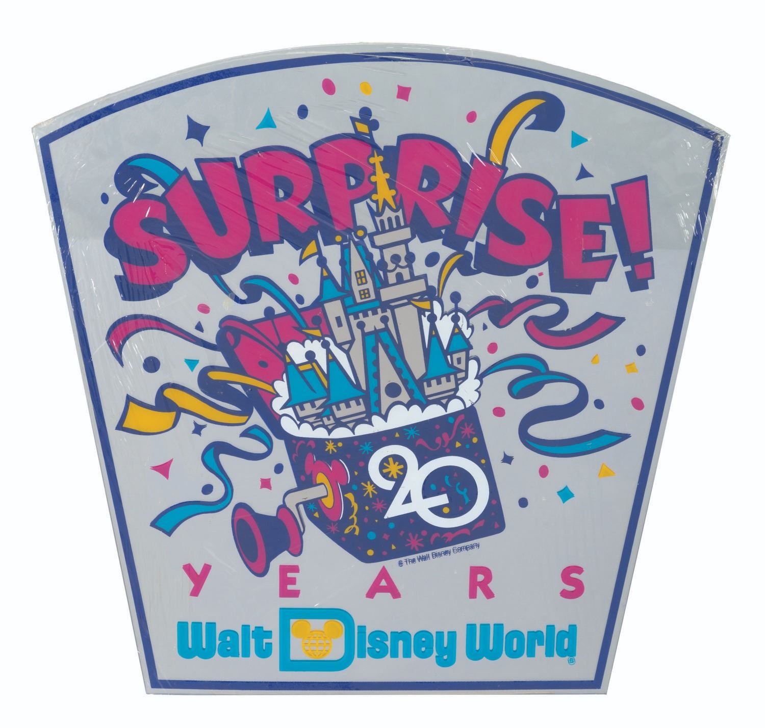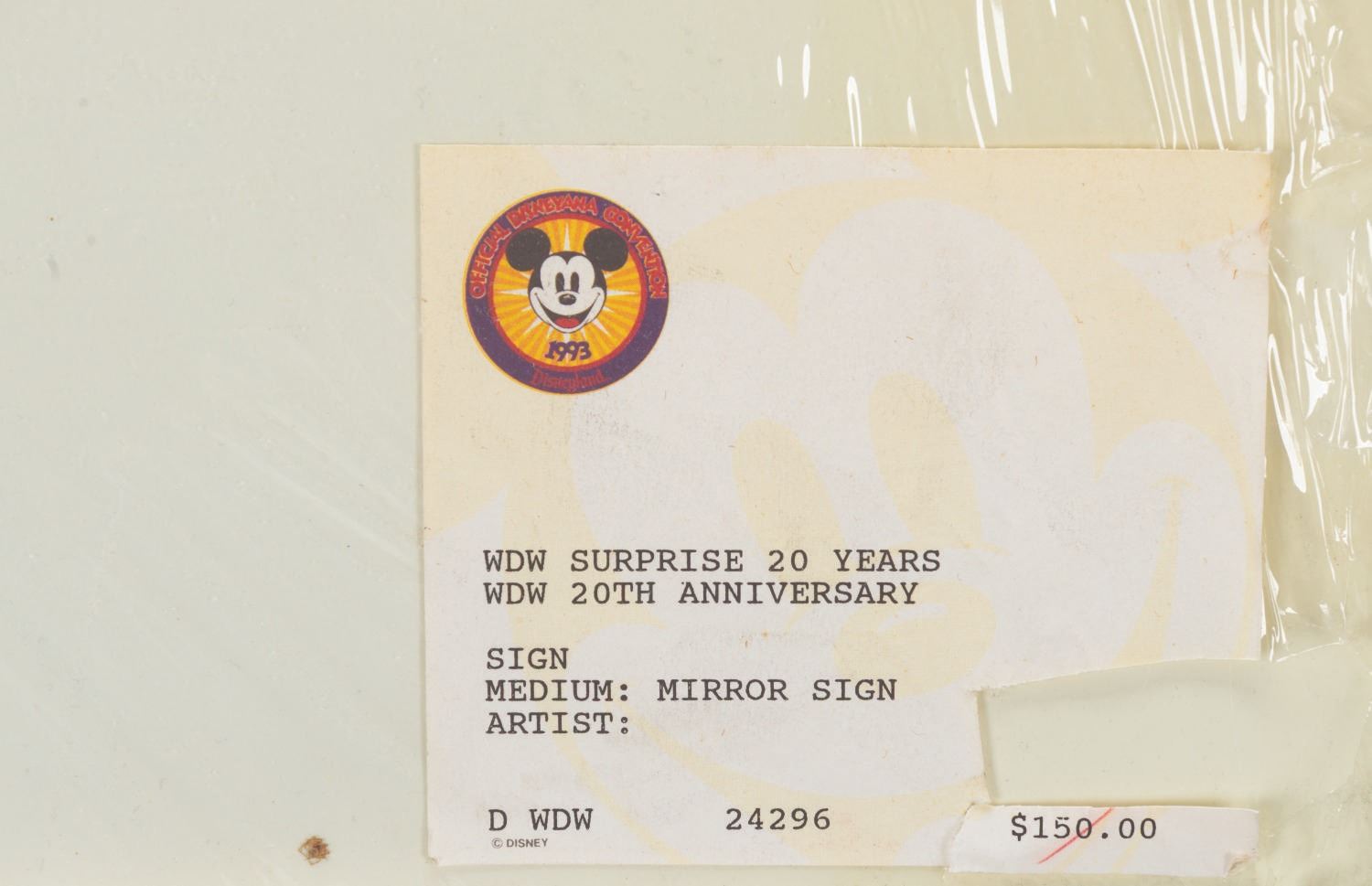 (Walt Disney World, 1991) A sign displayed for the 20th anniversary of Walt Disney World. Measuring 21.25" x 22", the acrylic mirror-backed sign is in very good condition with light scratches and wear.