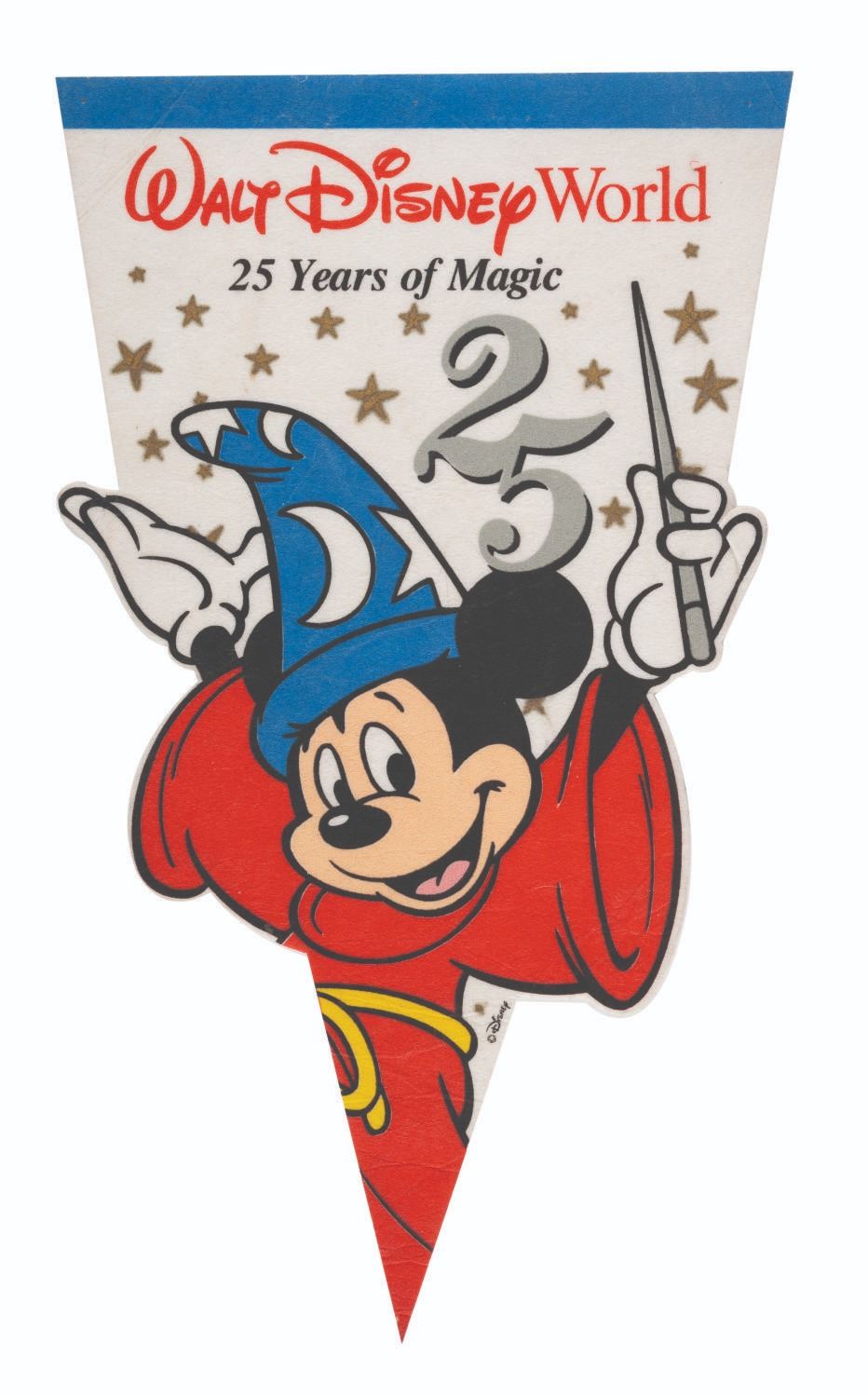 (Disneyland, 1996-98) A rare "25 Years of Magic" souvenir pennant from Walt Disney World. This unique felt pennant features imagery of the Sorcerer's Apprentice Mickey Mouse, in bold thematic colors. Measuring 17.5"x10.25", the piece is in very good condition with very light wear and few creases.